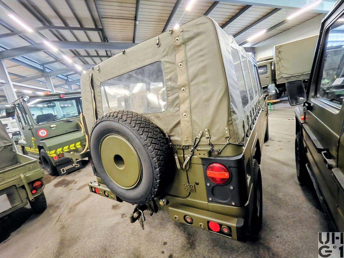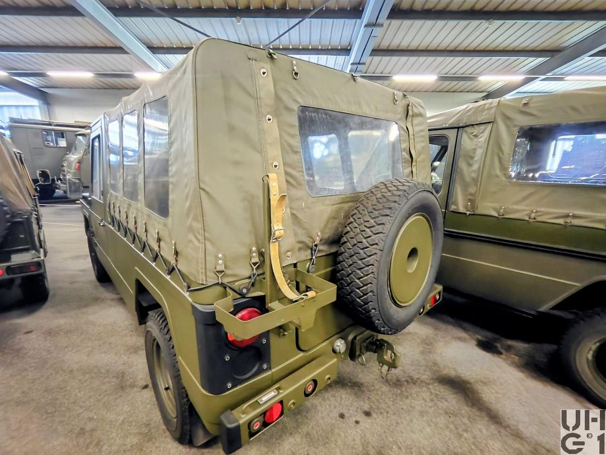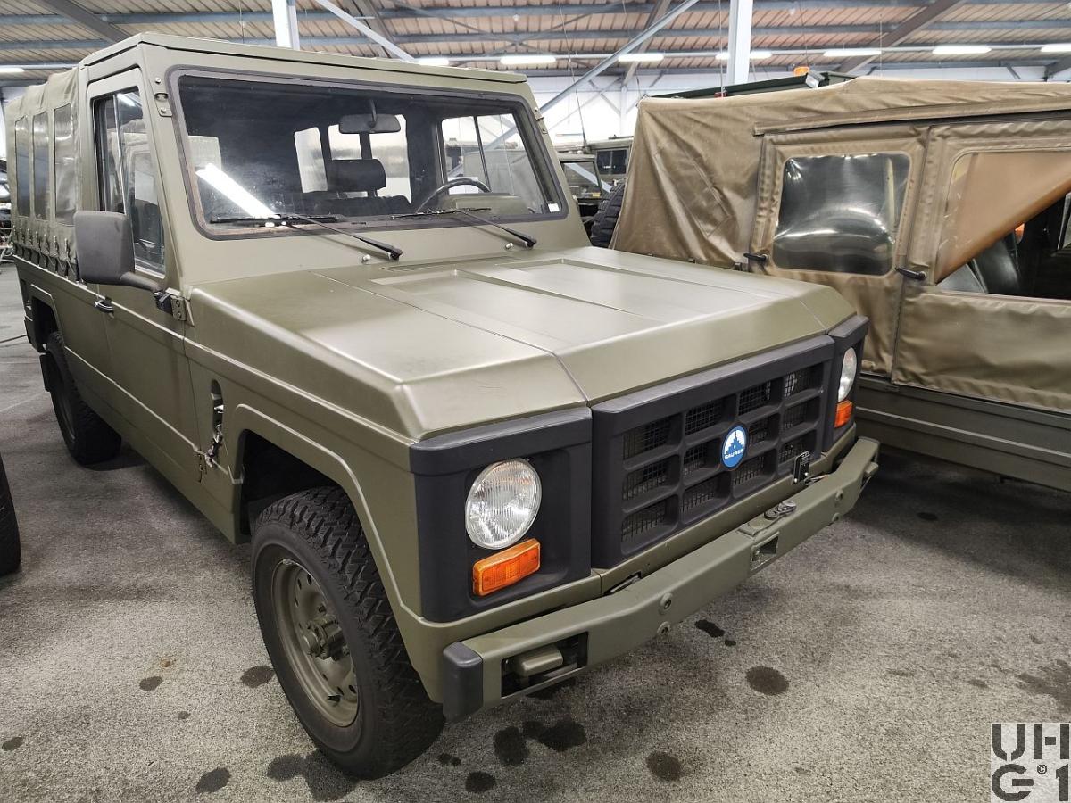| Achsen | Vorne Hersteller Dana Starrachse Antriebsachse mit einfach übersetztem Winkeltrieb Übersetzung 4,89:1 Antriebswellen mit freiliegenden Kreuzgelenken Achsschenkellagerung mit Kugelbolzen Parabelfedern mit Gummihohl-Zusatzfedern Doppeltwirkende, hydraulische Teleskopstossdämpfer Felgen 5.50 - 16 Bereifung Maloja Cresta Spezial 205R16C 110/L, 8Ply, Schlauchlos, Sommerreifen Michelin 205R16X M+S Reinforced, mit Schlauch, Winterreifen Einfachbereifung Hinten Hersteller Dana Starrachse Antriebsachse mit einfach übersetztem Winkeltrieb und selbstsperrendem Differential Übersetzung 4,89:1 Parabelfedern mit Gummihohl-Zusatzfedern Doppeltwirkende, hydraulische Teleskopstossdämpfer Felgen 5.50 - 16 Bereifung Maloja Cresta Spezial 205R16C 110/L, 8 Ply, schlauchlos, Sommerreifen Michelin 205R16X M+S Reinforced, mit Schlauch, Winterreifen Einfachbereifung |
