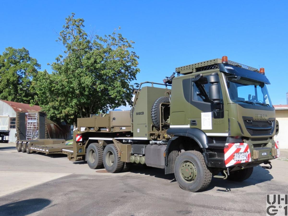 | Bemerkungen | Lieferanten Fahrgestell IVECO Magirus AG Aufbau Doll Fahrzeugbau Sattelanhänger 3-Achsig für Baumaschinentransport 13'370 mm + 2'695 mm Länge 3'400 mm Höhe 1'500 mm Sattelkuplungshöhe 2'550 mm Breite 4'500 mm + 2'695 mm Länge Tiefbett 3'430 mm / 3'095 mm Nutzbare Höhe 570 mm / 905 mm Ladehöhe 3'000 mm Nutzbare Breite 20'400 kg Leergewicht 23'600 kg (35'600 kg) Nutzlast 56'000 kg Gesamtgewicht 3 x 8'000 kg (3 x 12'000 kg) Max. Achslast 44'000 kg Max. Betriebsgewicht 20'000 kg Max. Sattellast Aufbau Sattel-Tiefbettanhänger ausziehbar mit 2-teiligen Auffahrrampen und einem hydraulisch anhebbaren Tiefbett, ausgerüstet für den Transport von Baumaschinen Anzahl 20 Sattel-Tiefbettanhänger Beschaffung Über Rp 2016 |