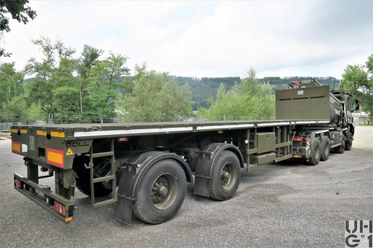 | Bemerkungen | Sattelanhänger Plattform 29 t, 2-Achsig P2H Doll 11'640 mm + 5'000 mm Länge 3'450 mm Höhe 1'500 mm Sattelkuplungshöhe 2'550 mm Breite 11'270 mm + 5'000 mm Nutzbare Länge 2'250 mm Nutzbare Höhe 1'750 mm Ladehöhe 2'550 mm Nutzbare Breite 11'000 kg Leergewicht 29'000 kg Nutzlast 40'000 kg Gesamtgewicht 2x10'000 kg Max. Achslast 20'000 kg Max. Sattellast Aufbau Sattel-Pritsche ausziehbar Zweck Transport von Panzerbrücken 14m und 26m mit Transportrahmen und Materialkasten Anzahl 12 Sattelanhänger Beschaffung Über Rp 2014 |