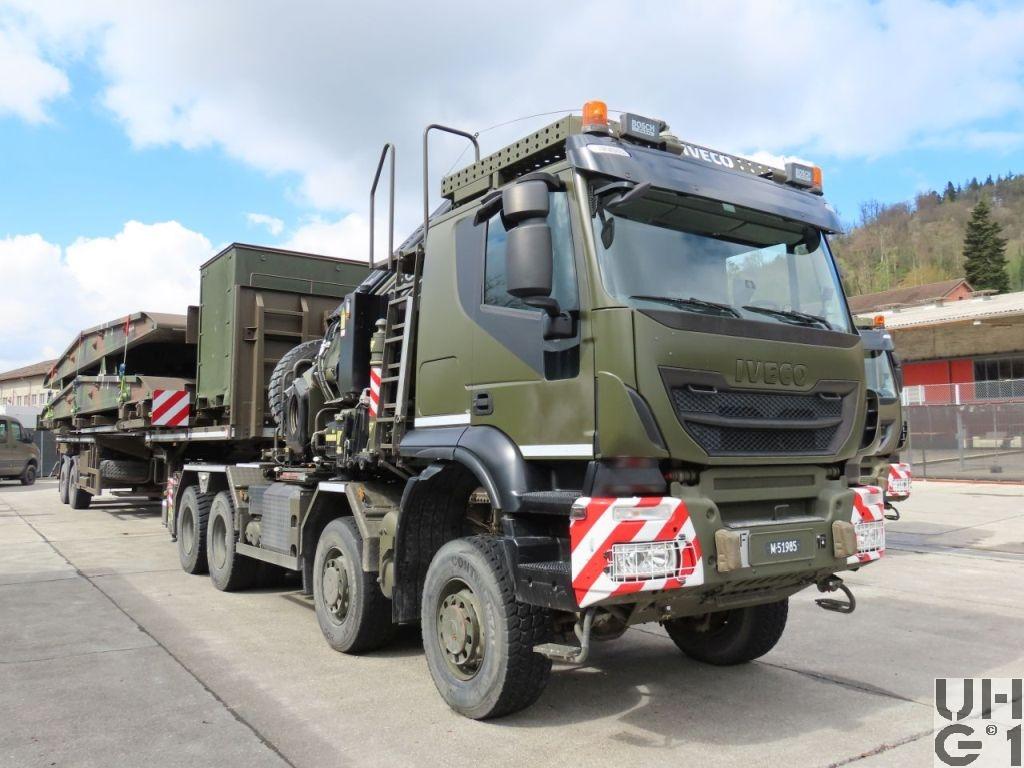 | Achsen | Vorne Starrachsen Doppelt übersetzte Antriebsachsen mit Radaussenantrieb Übersetzung 4,67:1 Je zwei doppelt wirkende hydraulische Teleskopstossdämpfer pro Achse Parabelfedern Lenkbare Hohlachsschenkel Drehstabstabilisator an der 1. Achse Differentialsperren automatisch betätigt Felgen 9.00 - 22,5 Stahlscheibenrad Bereifung Continental HDC 385/65R22,5 Einfachbereifung Reifendruckregelanlage Hinten Starrachsen Doppelt übersetzte Antriebsachsen mit Radaussenantrieb Übersetzung 4,67:1 Pneumatisch betätigtes Sperrdifferential Längssperren automatisch betätigt Achsführung über 4 Längslenker unten und 2 Längslenker oben Luftfederung ECAS an beiden Achsen Je 4 Luftbälge pro Achse Je zwei doppelt wirkende hydraulische Teleskopstossdämpfer pro Achse Drehstabstabilisator an beiden Achsen Felgen 9.00 - 22,5 Stahlscheibenrad Bereifung Continental HDC 1 315/80R22,5 Doppelbereifung Reifenregeldruckanlage |