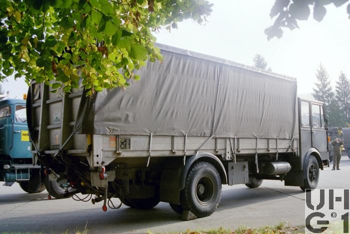 | Achsen | Vorne Starrachse als Faustachse ausgebildet Halbeliptische Längsblattfedern Hydraulische, doppeltwirkende Teleskopstossdämpfer Felgen 8.00 - 20 Trilex Schrägschulterfelgen +GF+ Stahlguss-Speichenräder Bereifung 11.00 - 20, 149/145 K 14 Ply Einfachbereifung Hinten Starrachse als Banjo Achse ausgebildet Antriebsachse mit Kegelraddifferential und doppelter Rücksetzung Differentialsperre elektro-pneumatisch betätigt Übersetzung 6,57:1 Radantrieb über Differentialwellen Halbelliptische Längsblattfedern Zusatzfedern Felgen 8.00 - 20 Trilex Schrägschulterfelgen +GF+ Stahlguss-Speichenräder Bereifung 11.00 - 20, 149/145 K 14 Ply Doppelbereifung |