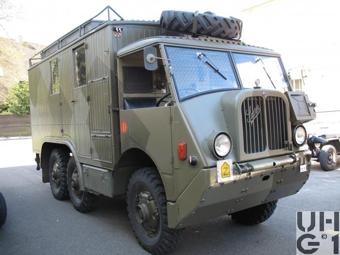| Getriebe | Hauptgetriebe Hersteller Saurer Typ 4 C Langbau Mechanisches Zahnrad Wechselgetriebe mit öldicht abgetrenntem Gehäuse für Vorgelege Unsynchronisiert 5 Vorwärtsgänge 1 Rückwärtsgang Stockschaltung Übersetzung 1. Gang 5,38:1 2. Gang 2,84:1 3. Gang 1,71:1 4. Gang 1,00:1 5. Gang 0,735:1 R. Gang 5,18:1 Verteilergetriebe Mechanisches Reduktions- und Verteilergetriebe mit 3 Schaltstufen für Strassen- und Geländegang und Seilwinde Vorderradantrieb wird mit Geländegang automatisch eingeschaltet Nebenantrieb für Seilwinde Untersetzung 0,94:1 Strassengang 1,85:1 Geländegang Bedienung der Schaltung 1 Schalthebel für Hauptgetriebe 1 Schalthebel für Geländegang |