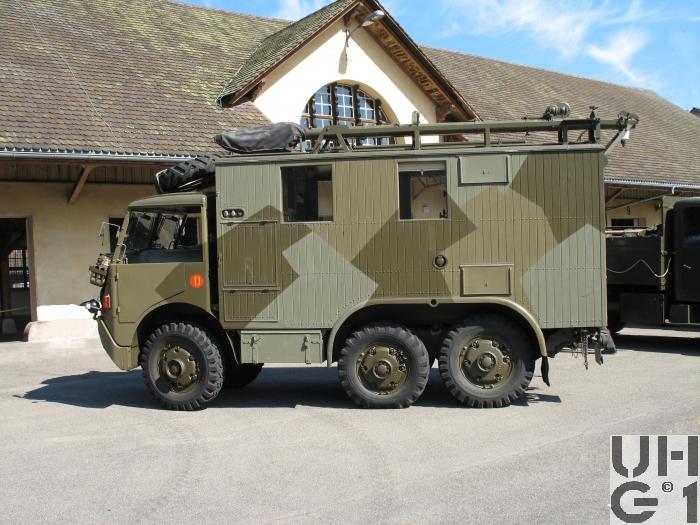 | Achsen | Vorne und hinten Pendelhalbachsen mit Drehpunkt auf Längstriebachse Progressiv gewundene Schraubenfedern, die über Schwinghebel und Zugstangen betätigt werden Die Achstrompeten sind in den Differentialgehäusen geführt Keine Stossdämpfer Alle Achsen mit selbstsperrenden Differentialen Vorne mit Freilauf Felgen 7.00 - 20 Trilex Stahlguss Felgen Bereifung Firestone Super All Traction 9.00 - 20, 12 Ply Alle Räder Einfachbereifung Funktion Die Halbachsen sind paarweise untereinander ausgeglichen durch Zugstangen und Kniehebel Das Fahrzeug wird von den hinteren 4 Pendelhalbachsen in der Mittellage gehalten, indem die zwei linken und die zwei rechten je durch eine Stange verbunden sind Die beiden vorderen Lenkhalbachsen sind wiederum miteinander über eine Ausgleichswaage verbunden, so dass sie das Fahrzeug vorne nur unterstützen und den Rahmen nicht verdrehen können |