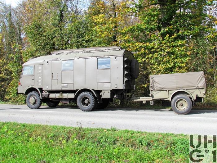 | Getriebe | Hauptgetriebe Hersteller FBW Typ GB Mechanisches Zahnrad Wechselgetriebe 3. und 4. Gang synchronisiert Sämtliche Gänge positiv verriegelt 4 Vorwärtsgänge 1 Rückwärtsgang Stockschaltung Übersetzung 1. Gang 5,90:1 2. Gang 3,26:1 3. Gang 1,76:1 4. Gang 1,00:1 R. Gang 7,10:1 Verteilergetriebe Hersteller FBW Typ GX Mechanisches Reduktions- und Verteilergetriebe mit 2 synchronisierten Schaltstufen für Strassen- und Geländegang Untersetzung 1,360:1 Strassengang 1,560:1 Geländegang Bedienung der Schaltung Schalthebel Schwarz: Hauptgetriebe Schalthebel Rot: Geländegang und Vorderradantrieb Schalthebel Gelb: Differentialsperre |