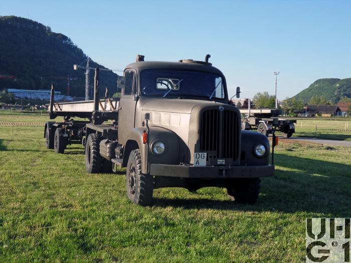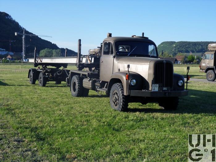 | Achsen | Vorne Starrachse Antriebsachse mit Kegelraddifferential und einfacher Rücksetzung Übersetzung 6,14:1 Radantrieb über homokinetische Antriebsgelenke Halbelliptische Längsblattfedern, 12 Blatt Hydraulische Teleskopstossdämpfer Felgen 7.50 - 20 Trilex Stahlguss Felgen Bereifung Firestone Super All Traction 9.00 - 20, 14 Ply, 136/133 J Einfachbereifung Hinten Starrachse Antriebsachse mit Kegelraddifferential und doppelter Rücksetzung Übersetzung 6,14:1 Radantrieb über Differentialwellen Halbelliptische Längsblattfedern, 11 Blatt Hilfsfeder Differentialsperre, pneumatisch betätigt Felgen 7.50 - 20 Trilex Stahlguss Felgen Bereifung Firestone Super All Traction 9.00 - 20, 14 Ply ,136/133 J Doppelbereifung |