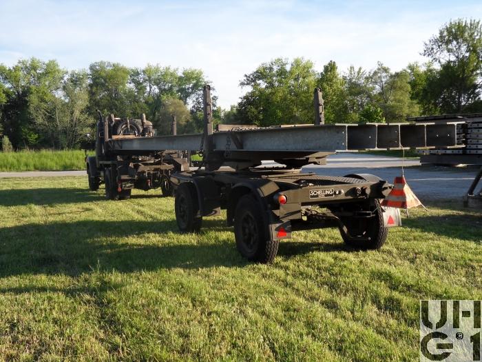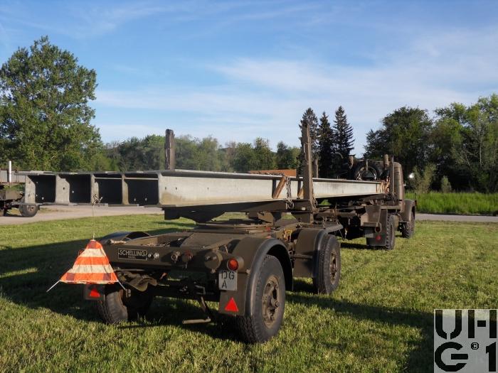 | Bemerkungen | M+Nummer M+82109 Einteilung Genie Stabs Kompanien Anhänger Langmatanh 7 t Schelling 3'000 kg Leergewicht 7'000 kg Nutzlast 10'000 kg Gesamtgewicht 5'950 mm Länge mit Deichsel 2'300 mm Breite 2'710 mm Höhe 2'800 mm Radstand Seilwinden Das Fahrzeug hat hinter der Kabine zwei Seilwinden zum aufladen des Langmaterials und des Anhängers eingebaut. Technische Daten Seilwinden Zugkraft pro Trommel: 3 t im Direktzug Seillänge: 75 m Seildurchmesser: 11 mm Untersetzung: 1:17,3 ins Langsame Mittlere Seilgeschwindigkeit: 19 m / Min |