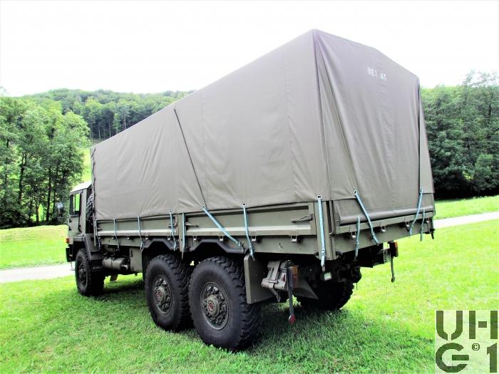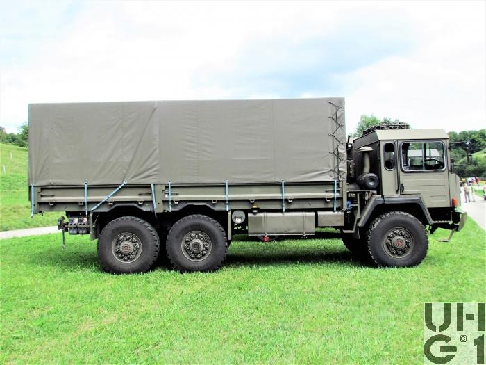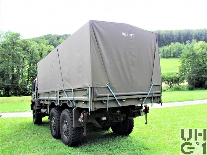 | Achsen | Vorne Starrachse Banjoachse aus Sphäroguss Antriebsachse mit einfach übersetztem Winkeltrieb und Planetenradnaben Übersetzung 7,343:1 Differential nicht sperrbar Halbelliptik Blattfeder mit 10 Blatt Gummiholfeder Hydraulische Teleskopstossdämpfer Koni 92X-1201 Felgen 10.00 - 20 Trilex Stahlguss Felgen Bereifung Semperit Gigant-Steel M+S 14.00 R 20, 22 Ply 164/160 G Einfachbereifung 1. Hinterachse Starrachse Banjoachse aus Sphäroguss Antriebsachse mit Stirnräderantrieb auf den einfach übersetzten Winkeltrieb Sperrbares Differential im Durchtrieb für die 2. Hinterachse Differentialsperre Planetenradnaben Übersetzung 7,343:1 Halbeliptik Blattfedern mit 8 Blatt Hydraulische Teleskop Stossdämpfer Koni 90X-1789 Felgen 10.00 - 20 Trilex Stahlguss Felgen Bereifung Semperit Gigant-Steel M+S 14.00 R 20, 22 Ply 164/160 G Einfachbereifung 2. Hinterachse Starrachse Banjoachse aus Sphäroguss Antriebsachse mit einfach übersetztem Winkeltrieb Differentialsperre Planetenradnaben Übersetzung 7,343:1 Halbelliptik Blattfedern mit 5 Blatt, mit Zusatzfedern und Gummihohlfedern Hydraulische Teleskop Stossdämpfer Koni 90X-1789 Felgen 10.00 - 20 Trilex Stahlguss Felgen Bereifung Semperit Gigant-Steel M+S 14.00 R 20, 22 Ply 164/160 G Einfachbereifung |