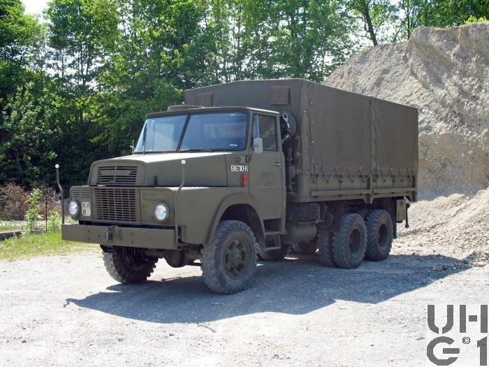 | Achsen | Vorne Starrachse Henschel Typ 7056 Banjoachse mit Achsgetriebe Antriebsachse mit Kegelraddifferential und doppelter Rücksetzung Untersetzung 8,54:1 Radantrieb über homokinetische Antriebsgelenke Halbelliptische Längsblattfedern Hydraulische Teleskopstossdämpfer Felgen 7.50 - 20 Trilexräder mit Schrägschulterfelgen Bereifung Firestone Super All Traction 10.00 - 20, 14 Ply, 142/139J Einfachbereifung Hinten 1. Hinterachse: Starrachse Henschel Typ 8080 Banjoachse mit Achsgetriebe Antriebsachse mit Kegelraddifferential und doppelter Rücksetzung Untersetzung 8,54:1 Radantrieb über Differentialwellen Ausgleich zwischen 1. und 2. Hinterachse 2. Hinterachse: Starrachse Henschel Typ 8090 Banjoachse mit Achsgetriebe Antriebsachse mit Kegelraddifferential und doppelter Rücksetzung Untersetzung 8,54:1 Radantrieb über Differentialwellen Halbelliptische Längsblattfedern, die je auf einem zentralen Zapfen drehbar gelagert sind. Sie sind an jedem Ende auf eine der beiden Hinterachsen abgestützt Längsführung der Achsen durch je 3 Längslenker Felgen 7.50 - 20 Trilexräder mit Schrägschulterfelgen Bereifung Firestone Super All Traction 10.00 - 20, 14 Ply, 142/139J Doppelbereifung |