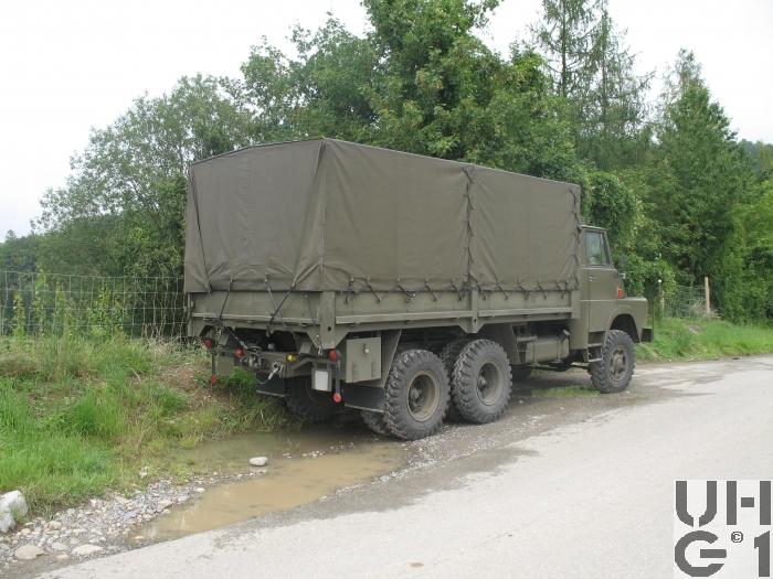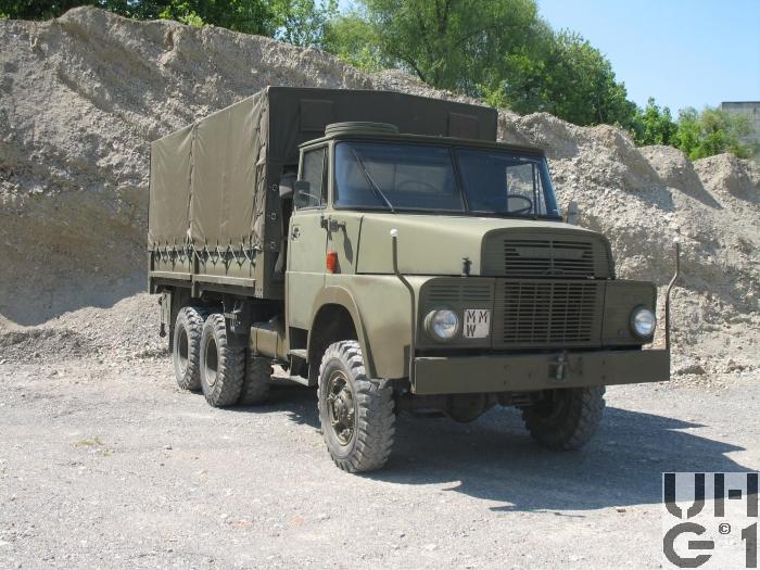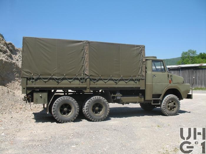 | Getriebe | Hauptgetriebe Hersteller ZF Typ AK 6-70-II Mechanisches Allklauengetriebe Schnellgangausführung Unsynchronisiert 6 Vorwärtsgänge 1 Rückwärtsgang Stockschaltung Geländegang Übersetzungen 1. Gang 6,63:1 2. Gang 3,88:1 3. Gang 2,43:1 4. Gang 1,55:1 5. Gang 1,00:1 6. Gang 0,71:1 R. Gang 5,66:1 Verteilergetriebe Hersteller Henschel Typ ZVA 340 Dreiwellengetriebe Mechanisches Reduktions- und Verteilergetriebe mit 2 Schaltstufen Mit Ausgleich zwischen Vorder- und Hinterachsen Elektropneumatisch geschaltet Zugknopf Rot Übersetzungen 1,00:1 Strassengang 1,32:1 Geländegang Differentialsperre In beiden Hinterachsen Elektropneumatisch geschaltet Zugknopf Gelb Bedienung der Schaltung Schalthebel Schwarz Hauptgetriebe Schalthebel Blau Seilwinde "auf-ab" Schalthebel Blau Seilwinde "ein-aus" Schalter Grün Längstriebsperren Schalter Gelb Differentialsperren Schalter Rot Verteilergetriebe |