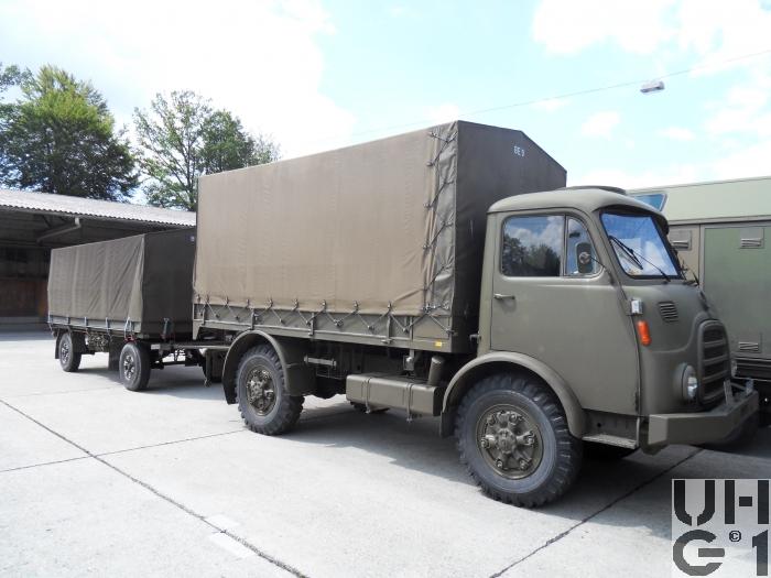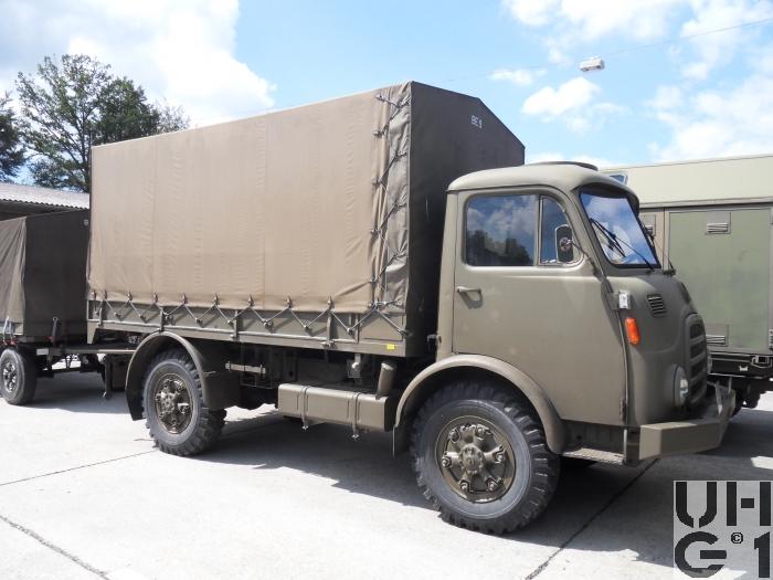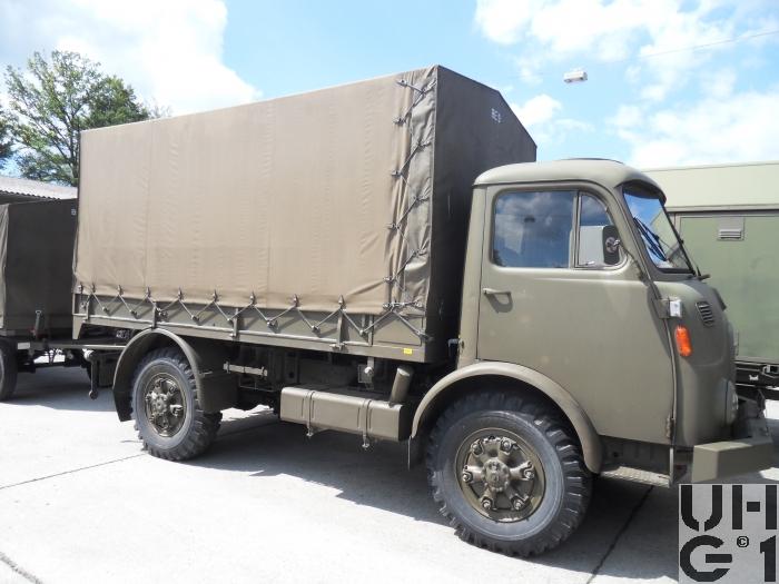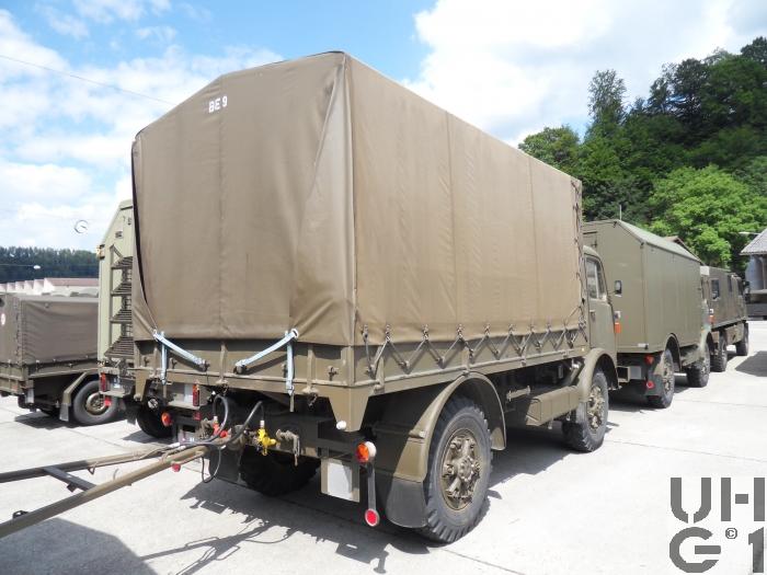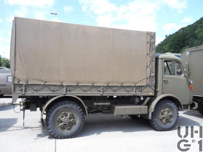 | Achsen | Vorne Starrachse Antriebsachse mit Hypoid Kegelradantrieb und einfacher Rücksetzung Übersetzung 6,17:1 Radantrieb über homokinetische Doppelkreuzgelenke Halbelliptische Längsblattfedern Hydraulische Teleskopstossdämpfer Felgen 7.50 - 20 GF Trilex Stahlfelgen Bereifung Firestone Super All Traction 10.00 - 20, 142/139 J, 14 Ply Einfachbereifung Hinten Starrachse Antriebsachse mit Hypoid Kegelradantrieb und einfacher Rücksetzung Übersetzung 6,14:1 Differentialsperre Druckluft betätigt Radantrieb über Achswellen Halbelliptische Längsblattfedern Felgen 7.50 - 20 GF Trilex Stahlfelgen Bereifung Firestone Super All Traction 10.00 - 20, 142/139 J, 14 Ply Einfachbereifung |