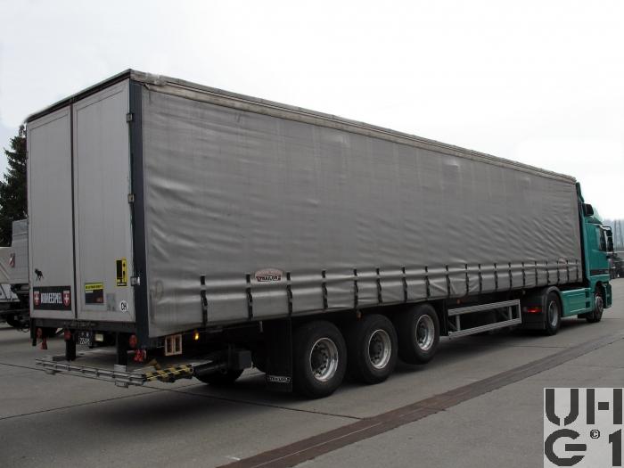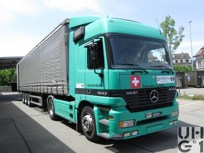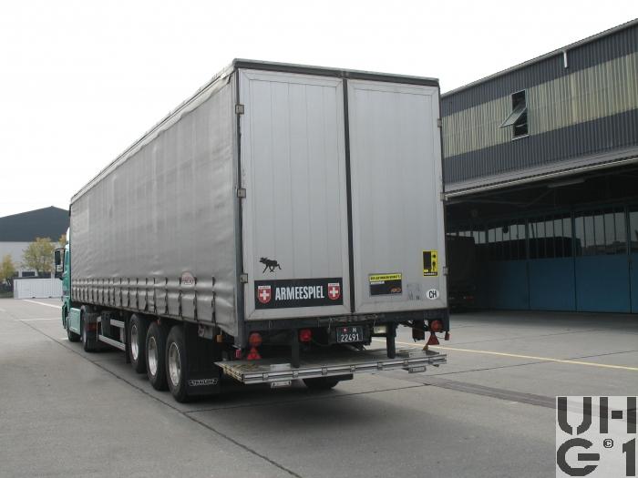 | Bemerkungen | Das Fahrzeug wird in ganz Europa für das Schweizer Armeespiel eingesetzt. M+Nummer Zugfahrzeug: M+22490 Auflieger: M+22491 Auflieger Trailor Typ SYY3CP Leergewicht 8'900 kg Nutzlast 25'600 kg Gesamtgewicht 34'500 kg Sattellast 10'500 kg Achslast 8'000 kg pro Achse Achsen Luftgefedert Bereifung 385 / 65 R 22.5 Länge Innen 13'600 mm Breite Innen 2'420 mm Höhe Innen 2'500 mm Hebebühne Mammut Lift |
