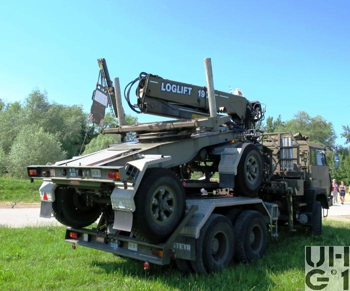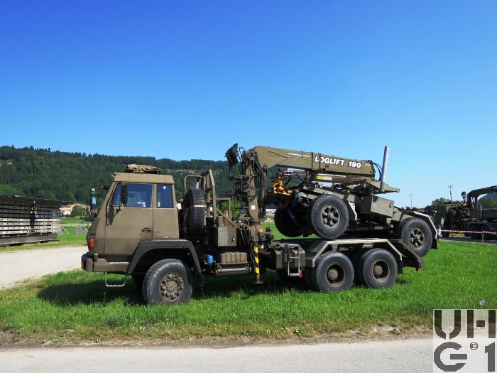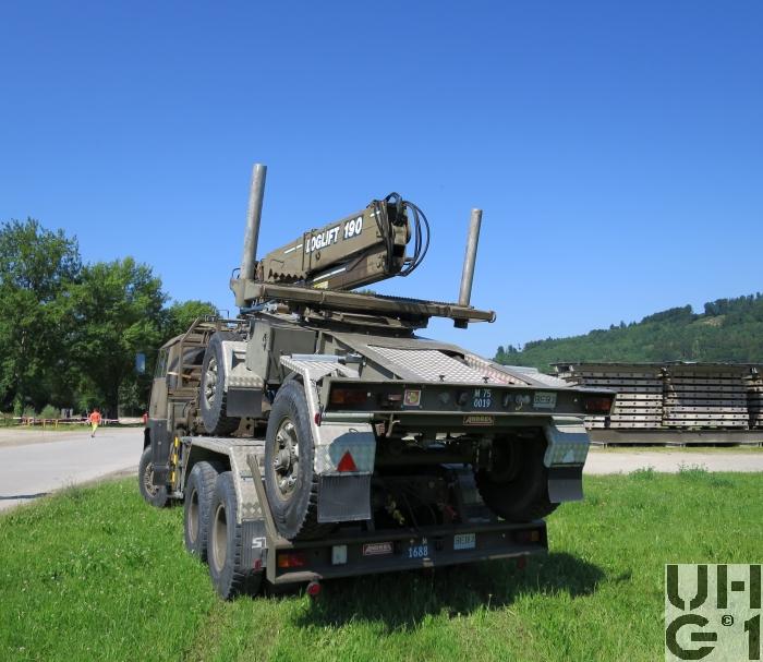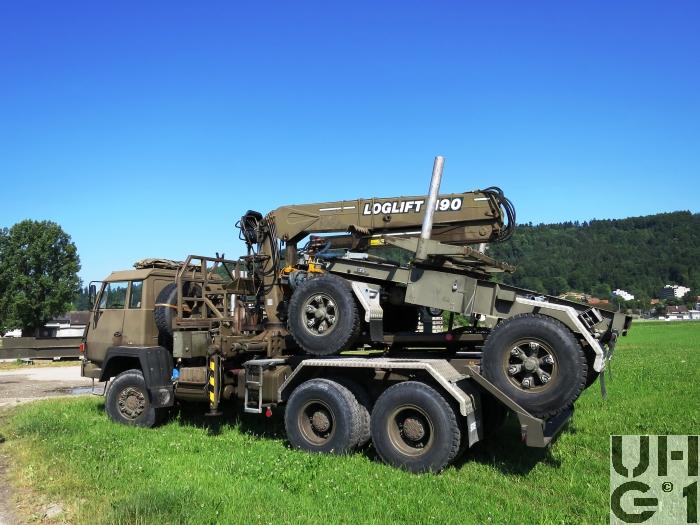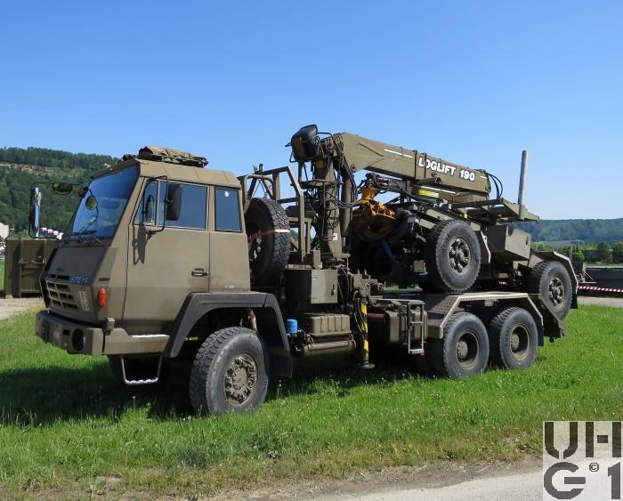 | Bemerkungen | Lieferanten Fahrgestell Steyr Nutzfahrzeuge, A-4400 Steyr Aufbau Herrmann Andres AG, CH-3250 Lyss Ladekran Kran+Hydraulik AG, CH-8370 Tagelswangen M+Nummern M+4975 Musterfahrzeug 19.06.1989 M+1676 bis M+1699 Serie Fahrzeuge Aufbau Langmaterialtransport mit Ladekran Einteilung Gt Kp G Stabskp Pont Stabskp Anhänger Langmatanh 11,5 t Andres SL-15/GRD 3'500 kg Leergewicht 11'500 kg Nutzlast 15'000 kg Gesamtgewicht 7'500 kg Max. Achslast vorne 7'500 kg Max. Achslast hinten 4'530 mm Länge 2'500 mm Breite 2'760 mm Höhe 1'650 mm Auflagehöhe 2'800 mm Radstand Trommelbremsen Bereifung Continental HDC 12.00 R 20 154/150 K Einfachbereifung Ladekran Loglift 190 S Hubkapazität 19m / t Ausladung 4,7 t bei 4 m Ausladung 2,5 t bei 7,8 m |