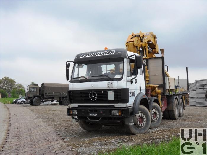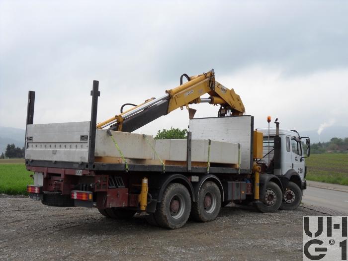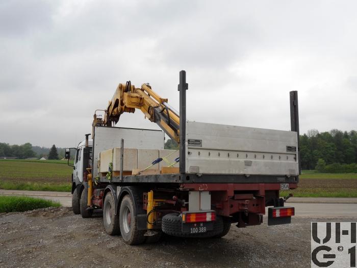 | Achsen | Vorne Starrachsen Parabelfederung Hydraulische Teleskopstossdämpfer Drehstabstabilisator Felgen 9.00 - 22,5 Stahlscheibenräder Bereifung Michelin XDY 315/80R22,5 156/150K Einfachbereifung Hinten Starrachsen Antriebsachsen doppelt übersetzt Aussenplaneten Übersetzung 4,57:1 Differentialsperren Druckluft betätigt Längssperren Druckluft betätigt Achsführung über 4 Längslenker unten und 2 Längslenker oben Pendelfederung Hydraulische Teleskopstossdämpfer Drehstabstabilisator Felgen 9.00 -22,5 Stahlscheibenräder Bereifung Michelin XDY 315/80R22,5 156/150L Doppelbereifung |