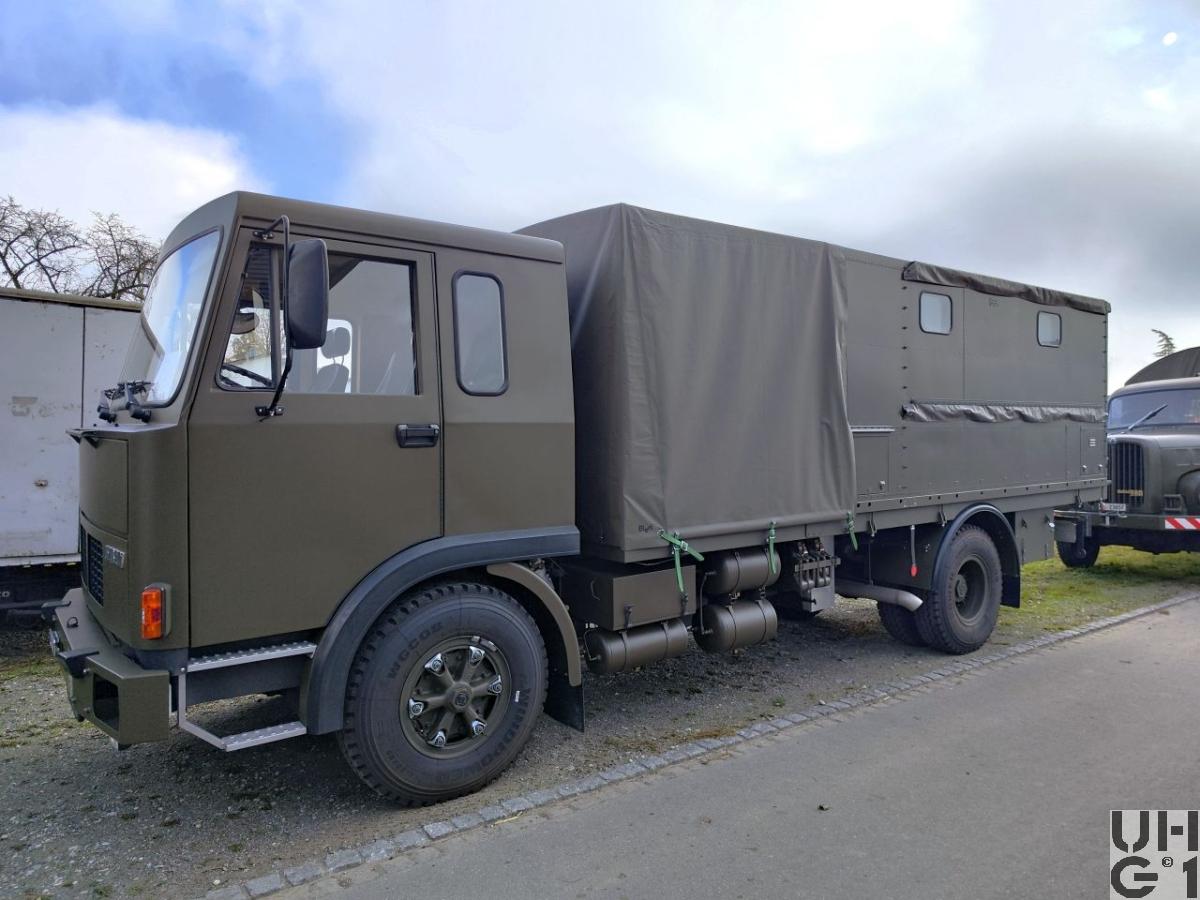 | Achsen | Vorne Starrachse als Faustachse ausgebildet Halbeliptische Längsblattfedern Hydraulische, doppeltwirkende Teleskopstossdämpfer Felgen 8.00 - 20 Bereifung 11.00 - 20, 150/147 K Einfachbereifung Hinten Starrachse als Banjo Achse ausgebildet Antriebsachse mit Kegelraddifferential und doppelter Rücksetzung Differentialsperre elektro-pneumatisch betätigt Übersetzung 6,57:1 Radantrieb über Differentialwellen Halbelliptische Längsblattfedern Zusatzfedern Felgen 8.00 - 20 Bereifung 11.00 - 20, 150/147 K Doppelbereifung |