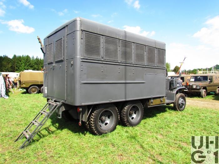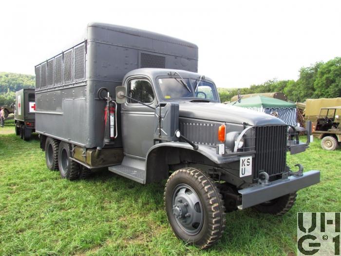 | Achsen | Vorne Hersteller GMC/Chevrolet Corporation Typ Banjo Starrachse Antriebsachse mit Hypoidantrieb und einfacher Rücksetzung Untersetzung 6,60:1 Radantrieb über homokinetische Antriebsgelenke Halbelliptische Längsblattfedern Hydraulische Hebelstossdämpfer Felgen Stahl Flachbettfelgen mit Sprengring Bereifung Firestone Ground Grip Type-ND 7.50 - 20, 8 Ply Einfachbereifung Hinten Hersteller GMC/Chevrolet Corporation Typ Banjo Starrachsen Antriebsachsen mit Hypoidantrieb und einfacher Rücksetzung Untersetzung 6,60:1 Radantrieb über Differentialwellen Halbelliptische Längsblattfedern, die je auf einem Privotzapfen drehbar gelagert und an jedem Ende auf eine der beiden Hinterachsen abgestützt sind Achsführung durch 4 gummigelagerte Torsionsstäbe unten und 2 gummigelagerte Torsionsstäbe oben Felgen Stahl Flachbettfelgen mit Sprengring Bereifung Firestone Ground Grip Type-ND 7.50 - 20, 8 Ply Doppelbereifung |