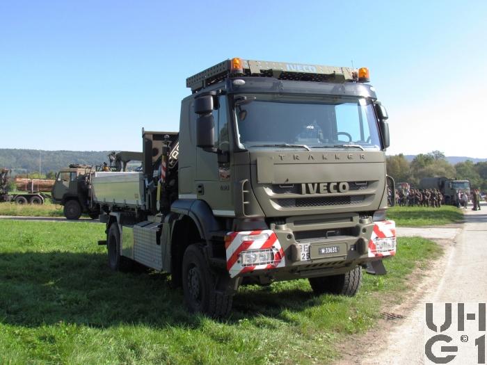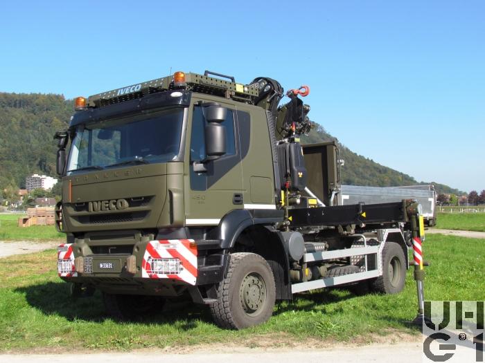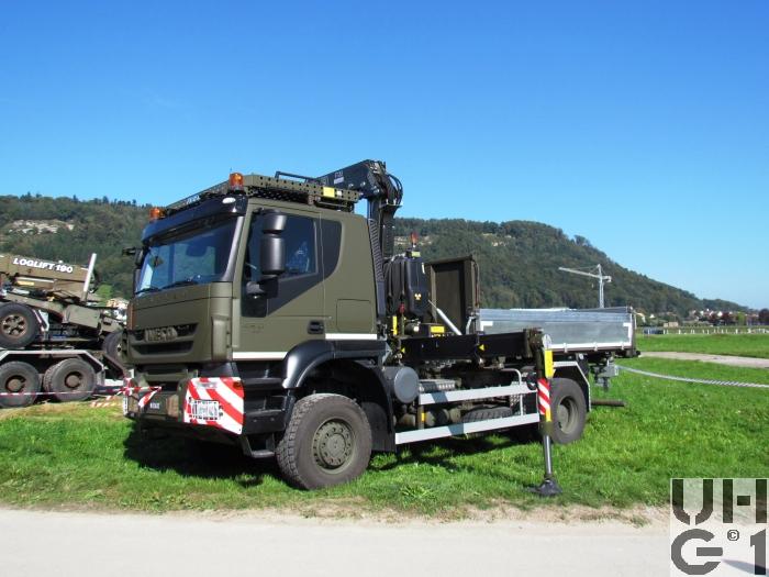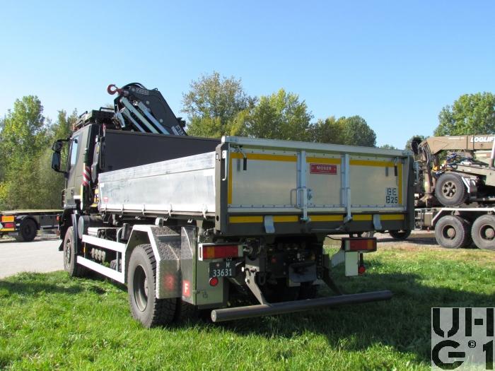 | Bemerkungen | Aufbau 3-Seiten Kippbrücke Fa. Moser Ladekran Hersteller Fassi Bergamo Italien Typ F135A.2.23 Ausladung auf 2'500 mm: 4'450 kg Ausladung auf 4'500 mm: 2'900 kg Ausladung auf 6'350 mm: 1'960 kg Ausladung auf 8'300 mm: 1'440 kg Ausladung auf 10'350 mm: 1'140 kg Kranbreite: 2'455 mm Kranhöhe: 2'365 mm Einbaubreite: 945 mm Schwenkbereich: 416° Schwenkmoment: 21,5 kNm Arbeitsdruck: 27,5 MPa Oelfördermenge: 40 l/min Oeltankgrösse: 90 Liter |