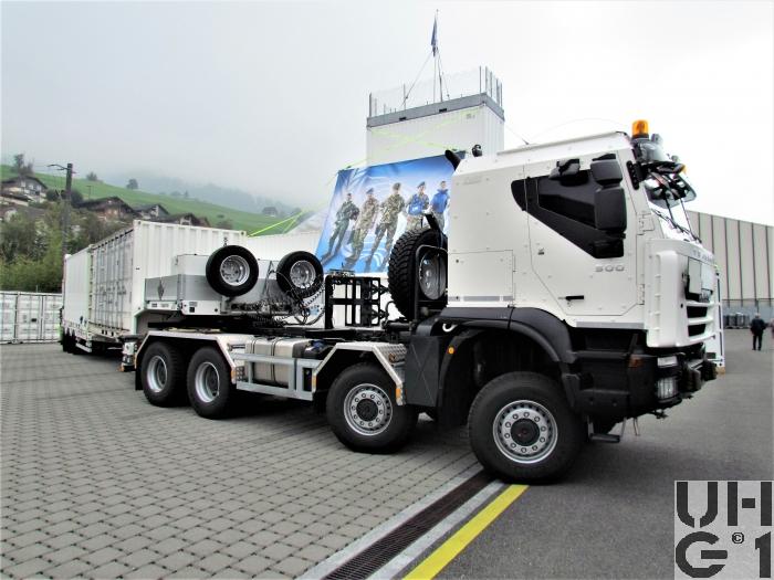 | Achsen | Vorne Starrachsen Doppelt übersetzte Antriebsachsen mit Radaussenantrieb Übersetzung 4,23:1 Je zwei doppelt wirkende hydraulische Teleskopstossdämpfer pro Achse Parabelfedern Lenkbare Hohlachsschenkel Drehstabstabilisator an der 1. Achse Differentialsperren automatisch betätigt Felgen 11.75 - 22.5 Stahlscheibenrad Bereifung Michelin XZ Y 3 385 / 65 R 22,5 158 L Einfachbereifung Hinten Starrachsen Doppelt übersetzte Antriebsachsen mit Radaussenantrieb Übersetzung 4,23:1 Pneumatisch betätigtes Sperrdifferential Längssperren automatisch betätigt Achsführung über 4 Längslenker unten und 2 Längslenker oben Halbelliptik Blattfedern in Pendelfederlagerung Je zwei doppelt wirkende hydraulische Teleskopstossdämpfer pro Achse Drehstabstabilisator an beiden Achsen Felgen 9.00 - 22,5 Stahlscheibenrad Bereifung Michelin X Works 315 / 80 R 22,5 156/150 K Doppelbereifung |