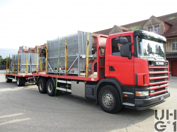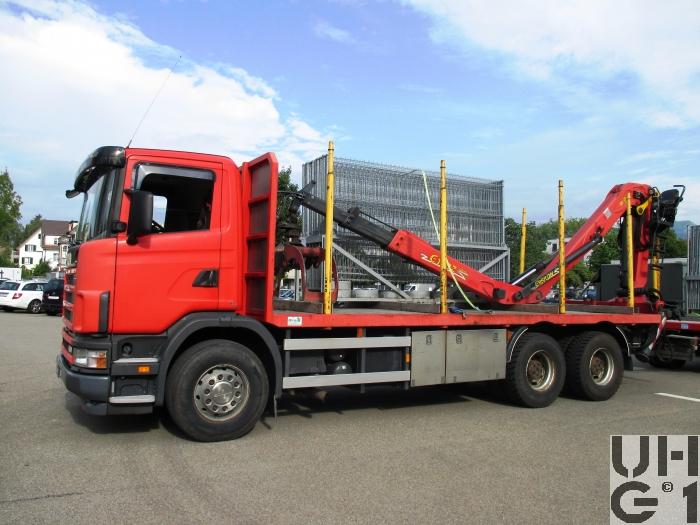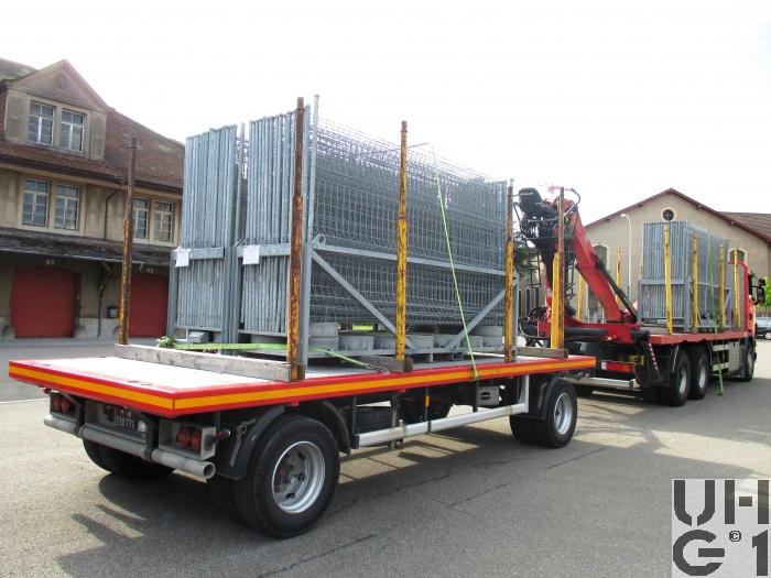 | Bemerkungen | Lieferanten Fahrgestell Scania Truck AG, CH-8302 Kloten Aufbau/Kran Kran und Hydraulik AG, CH-8317 Tagelswangen M+Nummer M+45350 Zugfahrzeug M+230779 Anhänger Aufbau Brücke für Holztransport mit Ladekran und Rungen Krananlage Hersteller Epsilon Typ E 140 Z 95 9'500 mm Ausladung 3'100 mm Hydraulische Teleskopbewegung 134 kNm Lastmoment netto 2x70 Liter Pumpenleistung 425° Schwenkbereich 30 kNm Schwenkmoment 225 bar Betriebsdruck 2'430 kg Eigengewicht |