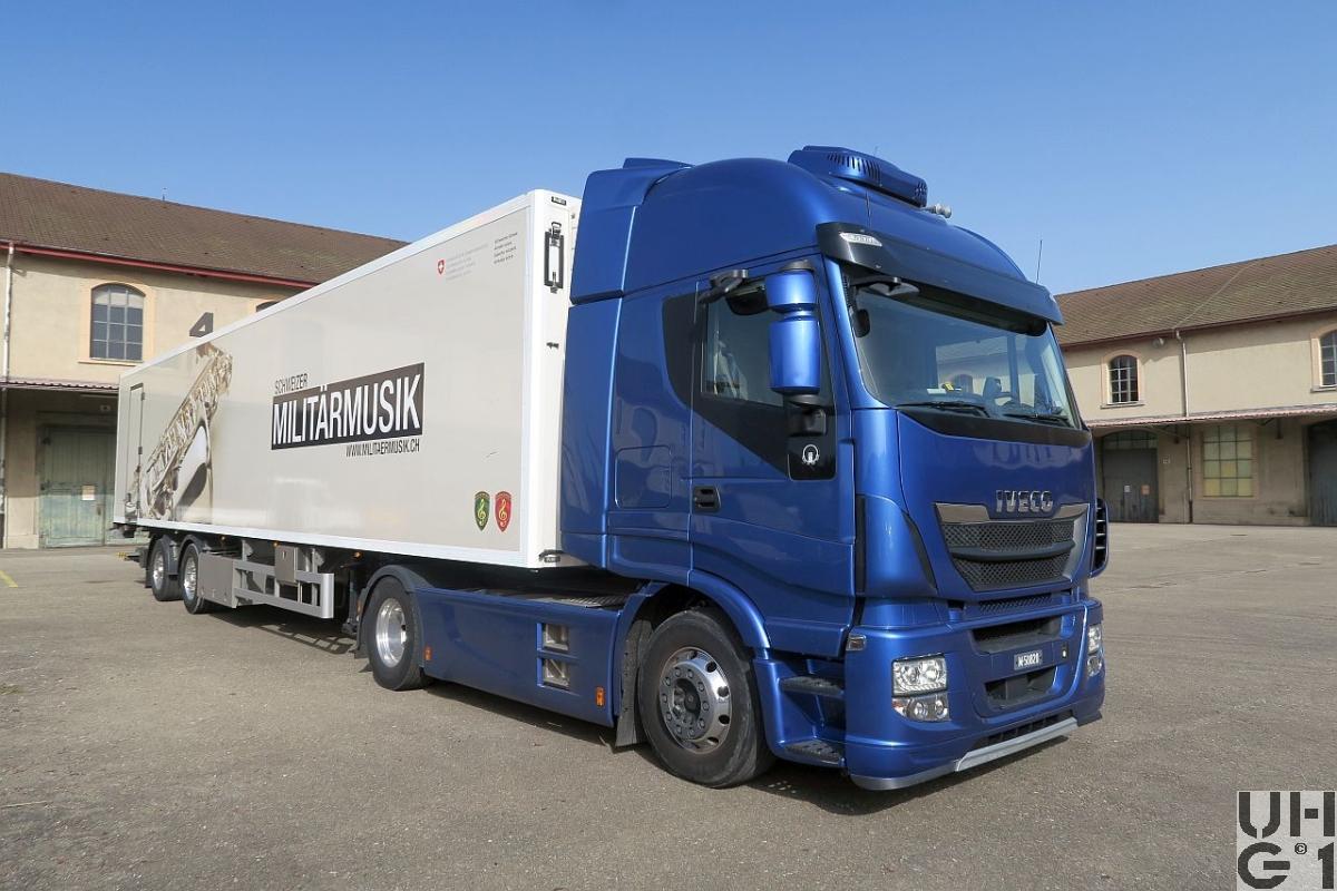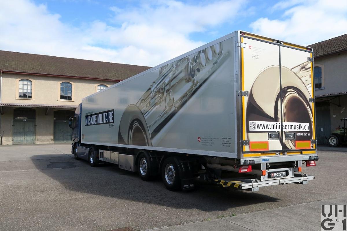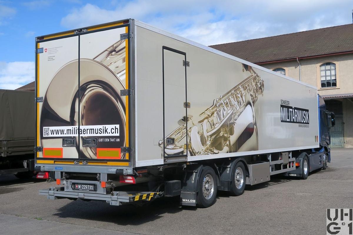 | Bemerkungen | M+Nummern M+50820 M+50821 Wird eingesetzt in ganz Europa zum Transport des Materials der Militärspiele Auflieger Mil. Bezeichnung: Sattelanh A-Spiel 19,5 t 2-Achs Walde Wu Hersteller: Carrosserie Walde Uster Länge: 14'000 mm Länge innen: 13'360 mm Breite: 2'550 mm Breite innen: 2'460 mm Höhe: 3'830 mm Höhe Innen: 2'460 mm Höhe ab Boden: 1'200 mm Achsabstand: 1'830 mm Felgen 9.00 - 22,5 Stahlscheibenrad Bereifung: 385/55 R 22,5 Leergewicht: 10'500 kg Nutzlast: 19'500 kg Gesamtgewicht: 30'000 kg M+Nummern M+229730 M+229731 |
