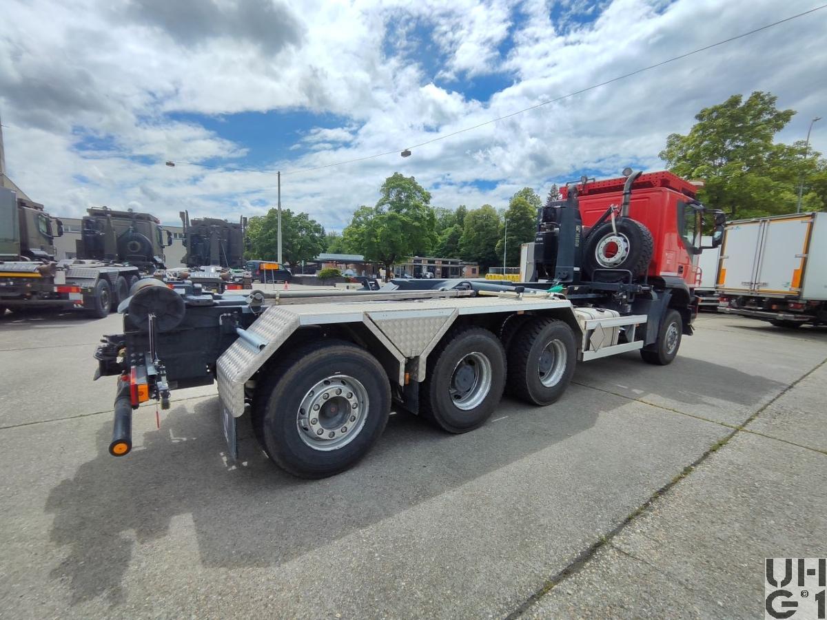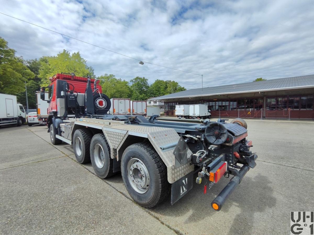 | Achsen | Vorne Starrachse Doppelt übersetzte Antriebsachse mit Radaussenantrieb Übersetzung 4,23:1 Zwei doppelt wirkende hydraulische Teleskopstossdämpfer Parabelfedern Lenkbare Hohlachsschenkel Drehstabstabilisator Differentialsperre automatisch betätigt Felgen 9.00 - 22,5 Stahlscheibenrad Bereifung Michelin XZY 3 385/65 R 22,5 153 L Einfachbereifung Halbautomatische Reifendruckregelanlage S.T.I.S. PTG Hinten Starrachsen Doppelt übersetzte Antriebsachsen mit Radaussenantrieb Übersetzung 4,23:1 Pneumatisch betätigtes Sperrdifferential Längssperren automatisch betätigt Parabelfederung pendelt gelagert Achsführung über 4 Längslenker unten und 2 Längslenker oben Je zwei doppelt wirkende hydraulische Teleskopstossdämpfer pro Achse Drehstabstabilisator an der 1. Achse Felgen 9.00 - 22,5 Stahlscheibenrad Bereifung Michelin XD Y 3 315/80 R 22,5 156/160 K Doppelbereifung Halbautomatische Reifenregeldruckanlage S.T.I.S. PTG Nachlaufachse Zwangsgelenkte Nachlaufachse Luftgefedert mit Anfahrentlastung Zwei Luftbälge Achsführung über zwei Längslenker unten Zwei doppelt wirkende hydraulische Teleskopstossdämpfer Drehstabstabilisator Felgen 9.00 - 22,5 Stahlscheibenrad Bereifung Michelin XZ Y 3 385/65 R 22,5 153 L Einfachbereifung Halbautomatische Reifenregeldruckanlage S.T.I.S. PTG |