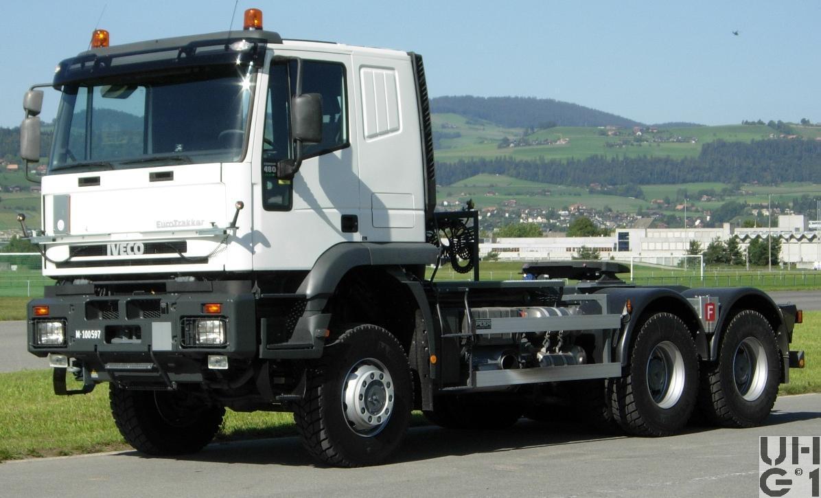 | Achsen | Vorne Starrachse Doppelt übersetzte Antriebsachse Aussenplaneten Übersetzung: 4,23:1 Differentialsperre automatisch betätigt Parabelfedern Hydraulische Teleskopstossdämpfer Querstabilisator Felgen 9.00 - 22,5 Stahlscheibenrad Bereifung Michelin X WORKS XDY 315/80 R 22,5 156/150 K Einfachbereifung Hinten Starrachsen Doppelt übersetzte Antriebsachsen Aussenplaneten Übersetzung: 4,23:1 Differentialsperren automatisch betätigt Längssperre für Achsen 2 + 3 Automatisch betätigt Luftfederung ECAS 2 Luftfederbälge pro Achse Achsführung über 4 Längslenker unten und 2 Längslenker oben Felgen 9.00 - 22,5 Stahlscheibenrad Bereifung Michelin X WORKS XDY-3 315/80 R 22,5 156/150 K Doppelbereifung |