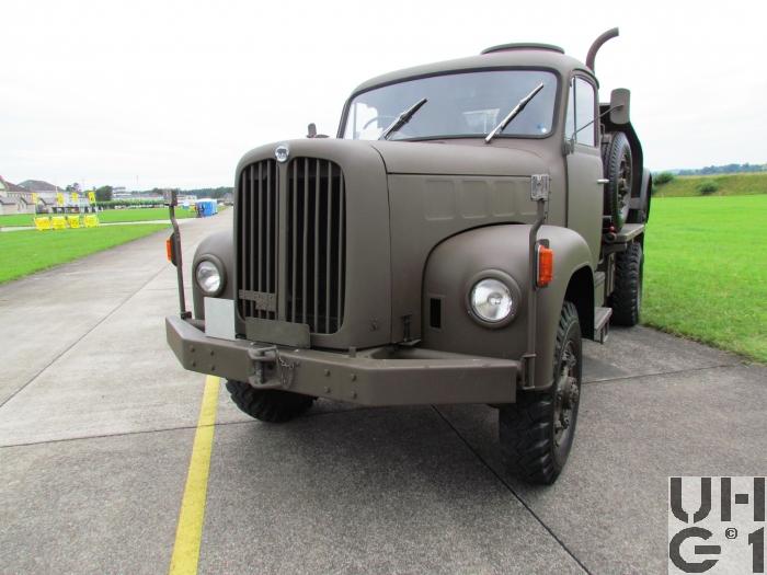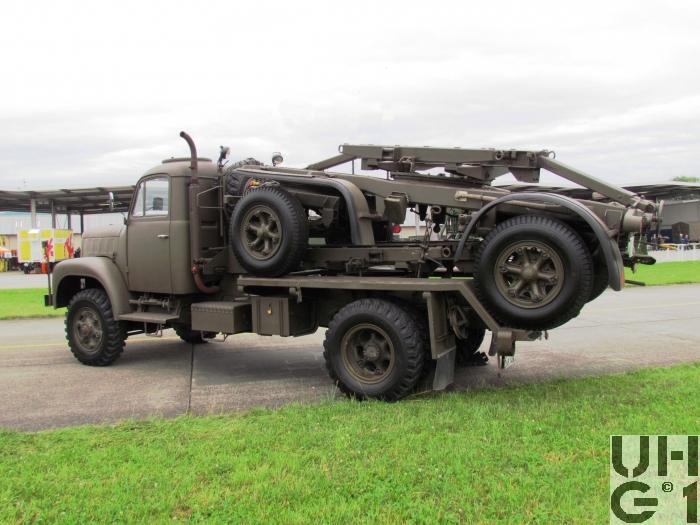 | Achsen | Vorne Starrachse Antriebsachse mit Kegelraddifferential und einfacher Rücksetzung Übersetzung 6,14:1 Radantrieb über homokinetische Antriebsgelenke Halbelliptische Längsblattfedern, 12 Blatt Hydraulische Teleskopstossdämpfer Felgen 7.50 - 20 Trilex Stahlguss Felgen Bereifung Firestone Super All Traction 9.00 - 20, 14 Ply, 136/133 J Einfachbereifung Hinten Starrachse Antriebsachse mit Kegelraddifferential und doppelter Rücksetzung Übersetzung 6,14:1 Radantrieb über Differentialwellen Halbelliptische Längsblattfedern, 11 Blatt Hilfsfeder Differentialsperre, pneumatisch betätigt Felgen 7.50 - 20 Trilex Stahlguss Felgen Bereifung Firestone Super All Traction 9.00 - 20, 14 Ply ,136/133 J Doppelbereifung |