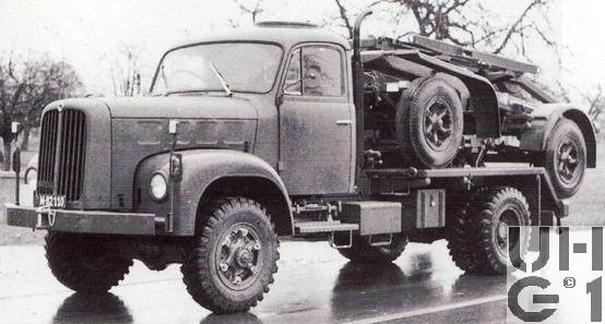 | Getriebe | Hauptgetriebe Hersteller Saurer Typ 2 D Mechanisches Zahnrad Wechselgetriebe mit Schnellganggruppe Sämtliche Gänge synchronisiert und positiv verriegelt 8 Vorwärtsgänge 2 Rückwärtsgänge Stockschaltung Pneumatische Schalthilfe Vorwählhebel für Schnellgang links unter Lenkrad Übersetzung 1. Gang 7,658:1 2. Gang 5,489:1 3. Gang 3,888:1 4. Gang 2,787:1 5. Gang 2,011:1 6. Gang 1,442:1 7. Gang 1,000:1 8. Gang 0,717:1 1. Gang Retour 6,873:1 2. Gang Retour 4,780:1 Verteilergetriebe Mechanisches Reduktions- und Verteilergetriebe mit 2 Schaltstufen für Strassen- und Geländegang ohne Synchronisation Stets Allradantrieb Sperrbares Stirnraddifferential zwischen Vorder- und Hinterachse Übersetzung 1,266:1 Strassengang 2,585:1 Geländegang Bedienung der Schaltung Schalthebel Schwarz: Hauptgetriebe Schalthebel Rot: Strassen- oder Geländegang Schalthahn: Für Differentialsperren 1 und 2 Pneumatisch betätigt |