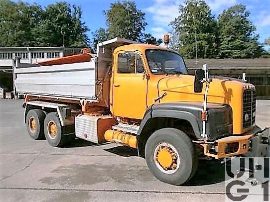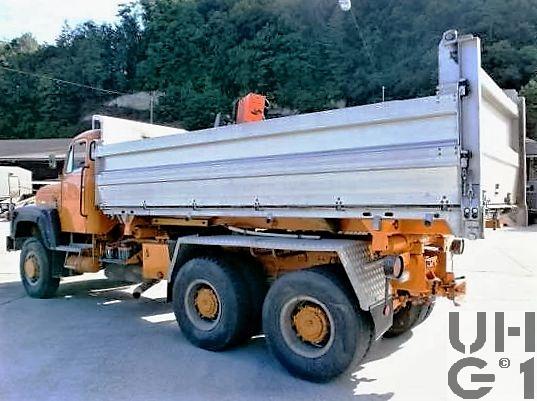 | Achsen | Vorne Starrachse Banjoachse aus Sphäroguss Antriebsachse mit einfach übersetztem Winkeltrieb Planetennaben Keine Differential-Quersperre Halbelliptik Blattfedern Gummihohl Zusatzfedern Teleskopstossdämpfer Querstabilisator Felgen 8.00 - 20 Trilex Stahlguss Felgen Bereifung: 11.00 R 20, 16 Ply Einfachbereifung 1. Hinterachse Starrachse Banjoachse aus Sphäroguss Antriebsachse mit sperrbarem Differential im Durchtrieb für die 2. Hinterachse Stirnradantrieb auf den einfach übersetzten Winkeltrieb Differentialsperre und Planetenradnaben Felgen 8.00 - 20 Trilex Stahlguss Felgen Bereifung: 11.00 R 20, 16 Ply Doppelbereifung 2. Hinterachse Starrachse Banjoachse aus Sphäroguss Antriebsachse mit einfach übersetztem Winkeltrieb Differentialsperre und Planetenradnaben Halbelliptik Blattfedern in Gleitlagern, pendelt gelagert Achsführung mit Längslenkern Felgen 8.00 - 20 Trilex Stahlguss Felgen Bereifung: 11.00 R 20, 16 Ply Doppelbereifung |