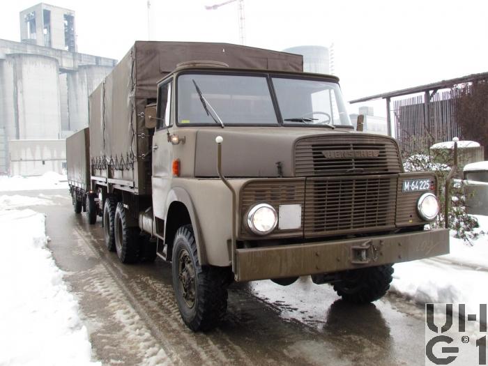 | Achsen | Vorne Starrachse Henschel Typ 7056 Banjoachse mit Achsgetriebe Antriebsachse mit Kegelraddifferential und doppelter Rücksetzung Untersetzung 8,54:1 Radantrieb über homokinetische Antriebsgelenke Halbelliptische Längsblattfedern Hydraulische Teleskopstossdämpfer Felgen 7.50 - 20 Trilexräder mit Schrägschulterfelgen Bereifung Firestone Super All Traction 10.00 - 20, 14 Ply, 142/139J Einfachbereifung Hinten 1. Hinterachse: Starrachse Henschel Typ 8080 Banjoachse mit Achsgetriebe Antriebsachse mit Kegelraddifferential und doppelter Rücksetzung Untersetzung 8,54:1 Radantrieb über Differentialwellen Ausgleich zwischen 1. und 2. Hinterachse 2. Hinterachse: Starrachse Henschel Typ 8090 Banjoachse mit Achsgetriebe Antriebsachse mit Kegelraddifferential und doppelter Rücksetzung Untersetzung 8,54:1 Radantrieb über Differentialwellen Halbelliptische Längsblattfedern, die je auf einem zentralen Zapfen drehbar gelagert sind. Sie sind an jedem Ende auf eine der beiden Hinterachsen abgestützt Längsführung der Achsen durch je 3 Längslenker Felgen 7.50 - 20 Trilexräder mit Schrägschulterfelgen Bereifung Firestone Super All Traction 10.00 - 20, 14 Ply, 142/139J Doppelbereifung |