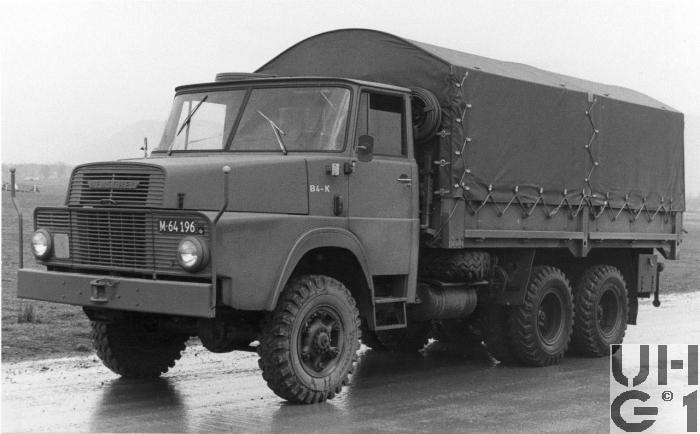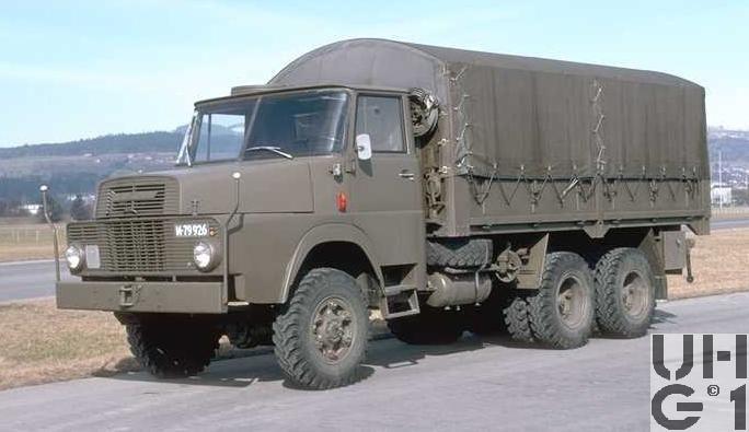 | Achsen | Vorne Starrachse Henschel Typ 7056 Banjoachse mit Achsgetriebe Antriebsachse mit Kegelraddifferential und doppelter Rücksetzung Untersetzung 8,54:1 Radantrieb über homokinetische Antriebsgelenke Halbelliptische Längsblattfedern Hydraulische Teleskopstossdämpfer Felgen 7.50 - 20 Trilexräder mit Schrägschulterfelgen Bereifung Firestone Super All Traction 10.00 - 20, 14 Ply, 142/139J Einfachbereifung Hinten 1. Hinterachse: Starrachse Henschel Typ 8080 Banjoachse mit Achsgetriebe Antriebsachse mit Kegelraddifferential und doppelter Rücksetzung Untersetzung 8,54:1 Radantrieb über Differentialwellen Ausgleich zwischen 1. und 2. Hinterachse 2. Hinterachse: Starrachse Henschel Typ 8090 Banjoachse mit Achsgetriebe Antriebsachse mit Kegelraddifferential und doppelter Rücksetzung Untersetzung 8,54:1 Radantrieb über Differentialwellen Halbelliptische Längsblattfedern, die je auf einem zentralen Zapfen drehbar gelagert sind. Sie sind an jedem Ende auf eine der beiden Hinterachsen abgestützt Längsführung der Achsen durch je 3 Längslenker Felgen 7.50 - 20 Trilexräder mit Schrägschulterfelgen Bereifung Firestone Super All Traction 10.00 - 20, 14 Ply, 142/139J Doppelbereifung |