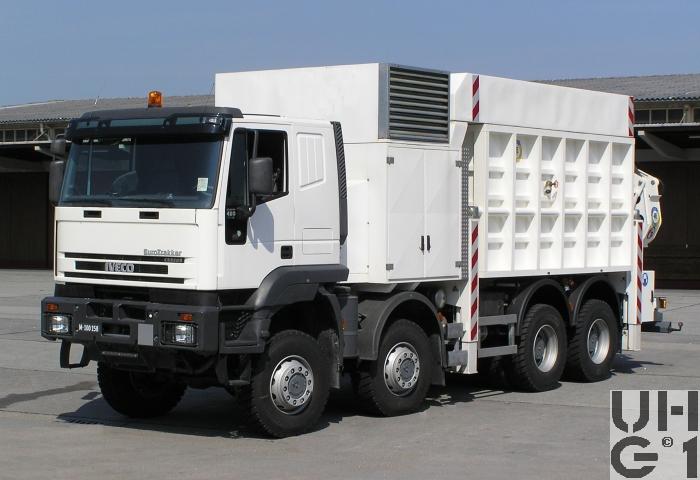 | Achsen | Vorne Starrachsen Doppelt übersetzte Antriebsachsen Aussenplaneten Übersetzung: 4,23:1 Differentialsperren automatisch betätigt Längssperre für Achsen 1 + 2 Automatisch betätigt Parabelfedern Hydraulische Teleskopstossdämpfer Querstabilisator Felgen 9.00 - 22,5 Stahlscheibenrad Bereifung Michelin X WORKS XDY 315/80 R 22,5 156/150 K Einfachbereifung Hinten Starrachsen Doppelt übersetzte Antriebsachsen Aussenplaneten Übersetzung: 4,23:1 Differentialsperren automatisch betätigt Längssperre für Achsen 3 + 4 Automatisch betätigt Parabelfedern pendelt gelagert Achsführung über 4 Längslenker unten und 2 Längslenker oben Felgen 9.00 - 22,5 Stahlscheibenrad Bereifung Michelin X WORKS XDY 315/80 R 22,5 156/150 K Doppelbereifung |