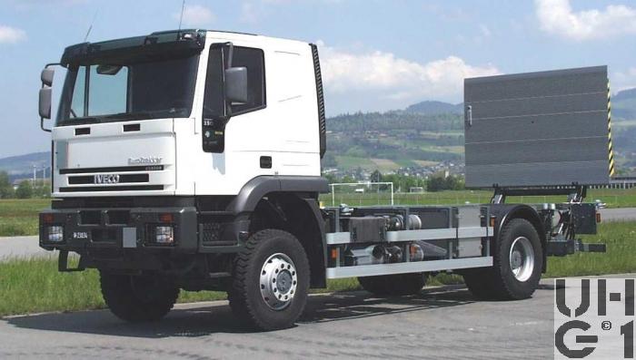 | Bemerkungen | Lieferanten Fahrgestell Iveco Magirus AG, D-89079 Ulm Wechselrahmen Kögel Fahrzeugbau AG, D-89079 Ulm Aufbau Wechselrahmen für WB C 625 und 20 Zoll ISO Container Das Wechselbehältersystem wird nicht durch die Truppe bedient, es wird ausschliesslich durch Personal von Logistik oder Infrastruktur Zentren bedient Hebebühne Trösch Cargolift 2'000 kg |