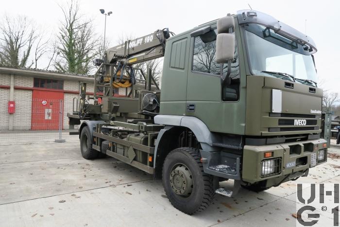 | Getriebe | Hauptgetriebe Hersteller ZF Typ 12 AS 2301 D.D Eurotronic 2 mit Intarder 12 Vorwärtsgänge 2 Rückwärtsgänge Vollautomatisiertes Schaltgetriebe mit geregelter Trockenkupplung ohne Kupplungspedal Das Getriebe besteht aus einem Hauptgetriebe mit einer Split- und Planetengruppe Das Hauptgetriebe ist klauengeschaltet Die Split- und Planetengruppe sind synchronisiert Das Getriebe kann im manuellen sowie im automatikfahrbetrieb gefahren werden Übersetzung 1. Gang 15,85:1 2. Gang 12,32:1 3. Gang 9,560:1 4. Gang 7,430:1 5. Gang 5,870:1 6. Gang 4,560:1 7. Gang 3,470:1 8. Gang 2,700:1 9. Gang 2,100:1 10. Gang 1,62:1 11. Gang 1,28:1 12. Gang 1,00:1 1. R-Gang 14,68:1 2. R-Gang 11,41:1 Verteilergetriebe Hersteller Steyr Typ VG 1600 Übersetzung 0,89:1 Strassengang 1,54:1 Geländegang Permanenter Allradantrieb mit Geländegang |