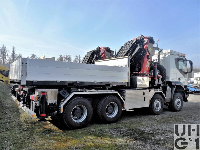 | Achsen | Vorne Starrachsen Doppelt übersetzte Antriebsachsen mit Radaussenantrieb Differentialsperren automatisch betätigt Übersetzung 4,23:1 Je zwei doppelt wirkende hydraulische Teleskopstossdämpfer pro Achse Parabelfedern Lenkbare Hohlachsschenkel Drehstabstabilisator an der 1. Achse Felgen 11,75 - 22,5 Stahlscheibenrad Bereifung Michelin XZY 3 385 / 65 R 22,5 160 K Notlaufeinlagen Hutchinson CRF HD/HS 22.5 Einfachbereifung Hinten Starrachsen Doppelt übersetzte Antriebsachsen mit Radaussenantrieb Differentialsperren automatisch betätigt Übersetzung 4,23:1 Längssperren automatisch betätigt Achsführung über 4 Längslenker unten und 2 Längslenker oben Halbelliptik Blattfedern in Pendelfederlagerung Drehstabstabilisator an beiden Achsen Je zwei doppelt wirkende hydraulische Teleskopstossdämpfer pro Achse Felgen 9.00 - 22,5 Stahlscheibenrad Bereifung Michelin XDY-3 315 / 80 R 22,5 156/150 K Notlaufeinlagen Hutchinson CRF HD/HS 22.5 Doppelbereifung |