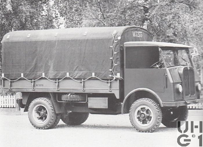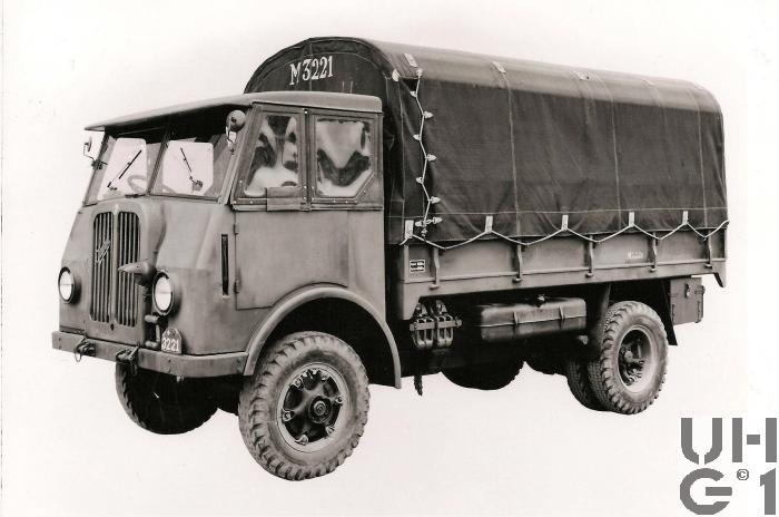 | Getriebe | Hauptgetriebe Hersteller Saurer Typ 2 C Mechanisches Zahnradwechselgetriebe 3. bis 5. Gang synchronisiert Sämtliche Gänge positiv verriegelt 5 Vorwärtsgänge 1 Rückwärtsgang Stockschaltung Übersetzung 1. Gang 4,88:1 2. Gang 3,00:1 3. Gang 1,70:1 4. Gang 1,00:1 5. Gang 0,75:1 R. Gang 5,14:1 Verteilergetriebe Mechanisches Reduktions- und Verteilergetriebe mit 2 synchronisierten Schaltstufen für Strassen- und Geländegang Nebenantrieb für Seilwinde Untersetzung 1,165:1 Strassengang 2,536:1 Geländegang Bedienung der Schaltung Schalthebel Schwarz: Hauptgetriebe Schalthebel Rot: Geländegang und Vorderradantrieb Schalthebel Gelb: Differentialsperre Schalthebel Blau: Seilwinde |