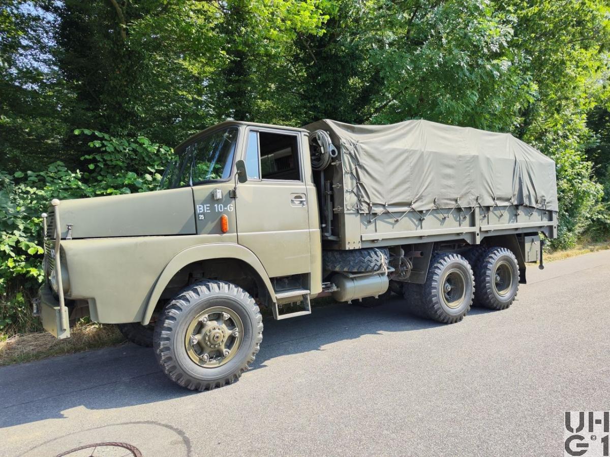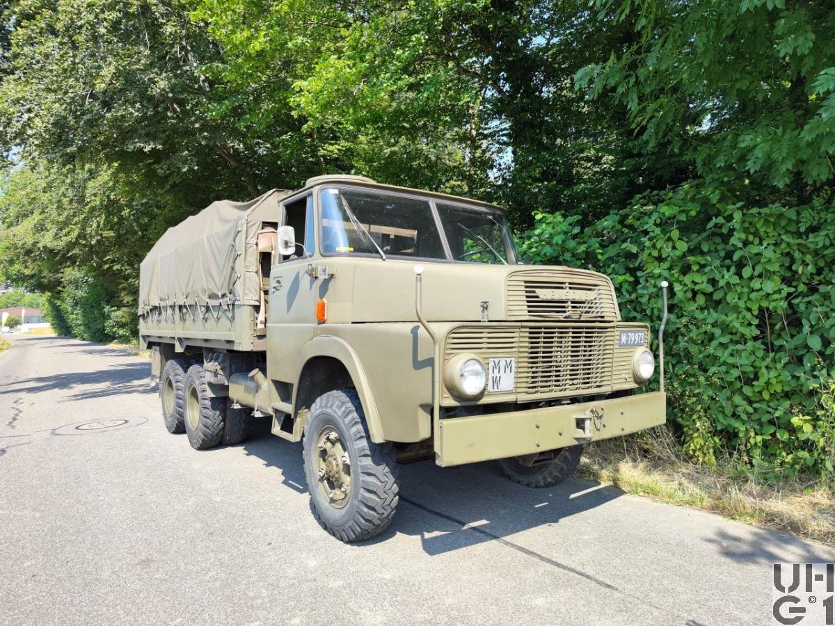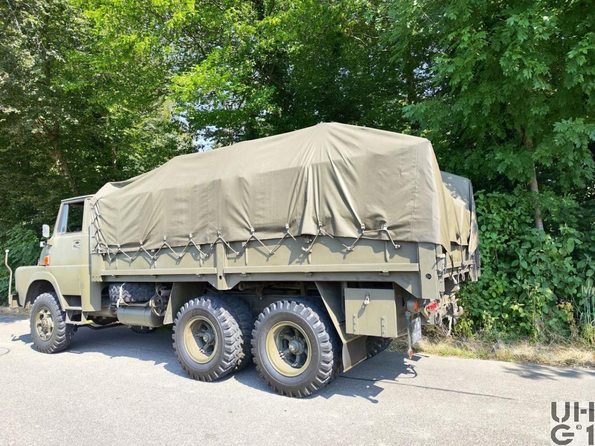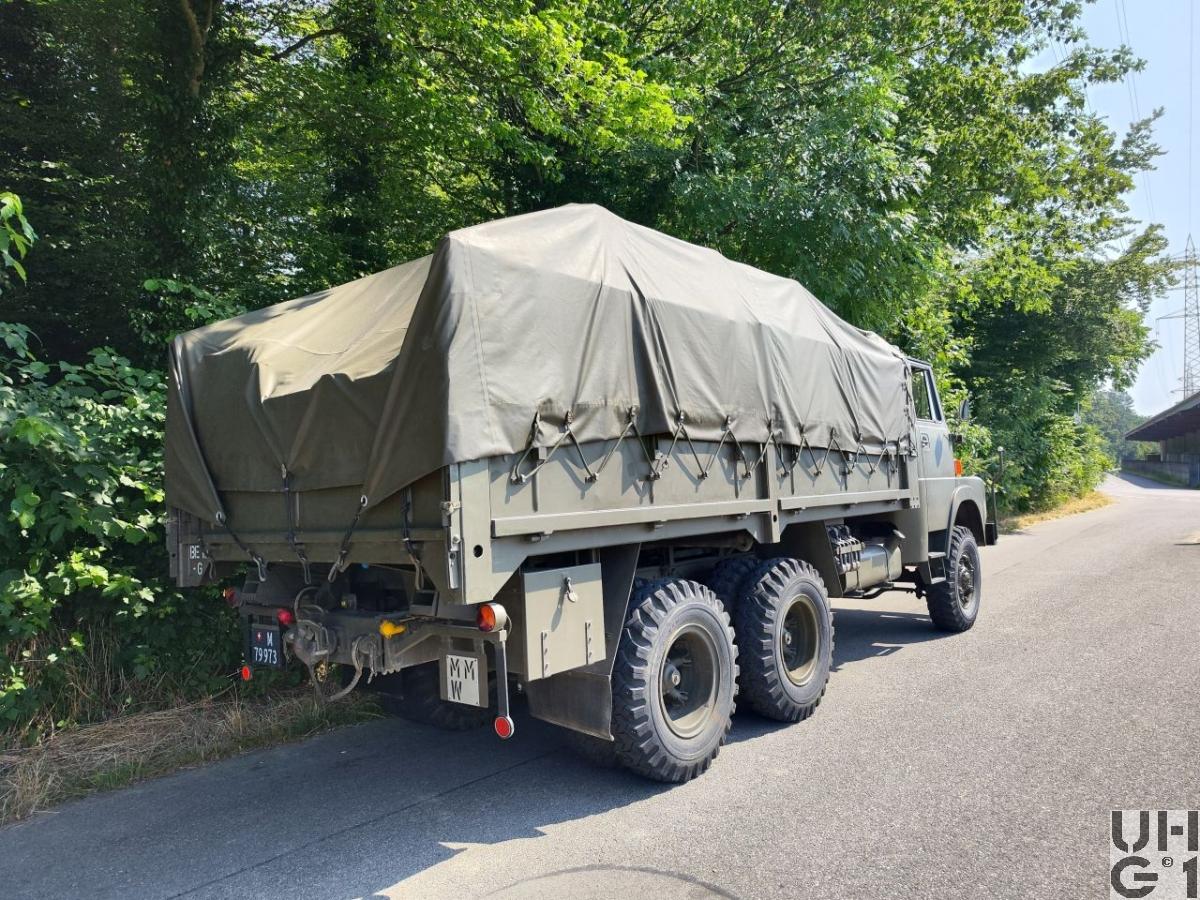 | Achsen | Vorne Starrachse Henschel Typ 7056 Banjoachse mit Achsgetriebe Antriebsachse mit Kegelraddifferential und doppelter Rücksetzung Untersetzung 8,54:1 Radantrieb über homokinetische Antriebsgelenke Halbelliptische Längsblattfedern Hydraulische Teleskopstossdämpfer Felgen 7.50 - 20 Trilexräder mit Schrägschulterfelgen Bereifung Firestone Super All Traction 10.00 - 20, 14 Ply, 142/139J Einfachbereifung Hinten 1. Hinterachse: Starrachse Henschel Typ 8080 Banjoachse mit Achsgetriebe Antriebsachse mit Kegelraddifferential und doppelter Rücksetzung Untersetzung 8,54:1 Radantrieb über Differentialwellen Ausgleich zwischen 1. und 2. Hinterachse 2. Hinterachse: Starrachse Henschel Typ 8090 Banjoachse mit Achsgetriebe Antriebsachse mit Kegelraddifferential und doppelter Rücksetzung Untersetzung 8,54:1 Radantrieb über Differentialwellen Halbelliptische Längsblattfedern, die je auf einem zentralen Zapfen drehbar gelagert sind. Sie sind an jedem Ende auf eine der beiden Hinterachsen abgestützt Längsführung der Achsen durch je 3 Längslenker Felgen 7.50 - 20 Trilexräder mit Schrägschulterfelgen Bereifung Firestone Super All Traction 10.00 - 20, 14 Ply, 142/139J Doppelbereifung |