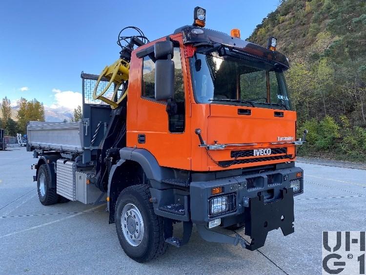 | Getriebe | Hauptgetriebe Hersteller ZF Typ 12 AS 2301 IT D.D Eurotronic 2 mit Intarder 12 Vorwärtsgänge 2 Rückwärtsgänge Vollautomatisiertes Schaltgetriebe mit geregelter Trockenkupplung ohne Kupplungspedal Das Getriebe besteht aus einem Hauptgetriebe mit einer Split- und Planetengruppe Das Hauptgetriebe ist klauengeschaltet Die Split- und Planetengruppe sind synchronisiert Das Getriebe kann im manuellen sowie im automatikfahrbetrieb gefahren werden Übersetzung 1. Gang 15,85:1 2. Gang 12,32:1 3. Gang 9,560:1 4. Gang 7,430:1 5. Gang 5,870:1 6. Gang 4,560:1 7. Gang 3,470:1 8. Gang 2,700:1 9. Gang 2,100:1 10. Gang 1,62:1 11. Gang 1,28:1 12. Gang 1,00:1 1. R-Gang 14,68:1 2. R-Gang 11,41:1 Verteilergetriebe Hersteller Iveco Typ TC 1800 Übersetzung 1,00:1 Strassengang 1,60:1 Geländegang Permanenter Allradantrieb mit Geländegang |