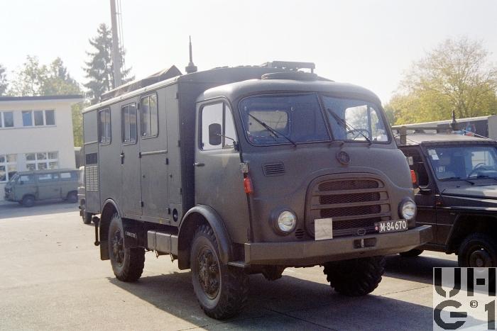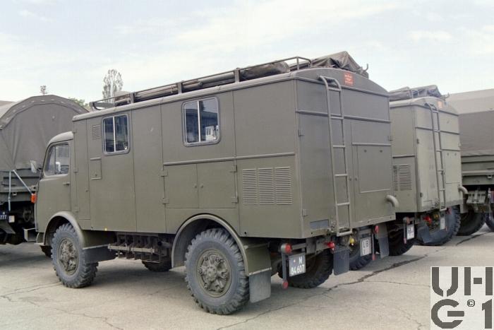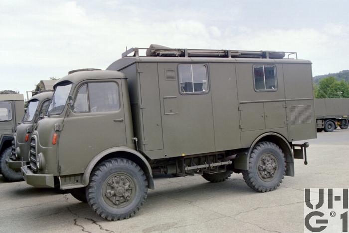 | Achsen | Vorne Starrachse Antriebsachse mit Hypoid Kegelradantrieb und einfacher Rücksetzung Übersetzung 6,17:1 Radantrieb über homokinetische Doppelkreuzgelenke Halbelliptische Längsblattfedern Hydraulische Teleskopstossdämpfer Felgen 7.50 - 20 GF Trilex Stahlfelgen Bereifung Firestone Super All Traction 10.00 - 20, 142/139 J, 14 Ply Einfachbereifung Hinten Starrachse Antriebsachse mit Hypoid Kegelradantrieb und einfacher Rücksetzung Übersetzung 6,14:1 Differentialsperre Druckluft betätigt Radantrieb über Achswellen Halbelliptische Längsblattfedern Felgen 7.50 - 20 GF Trilex Stahlfelgen Bereifung Firestone Super All Traction 10.00 - 20, 142/139 J, 14 Ply Einfachbereifung |