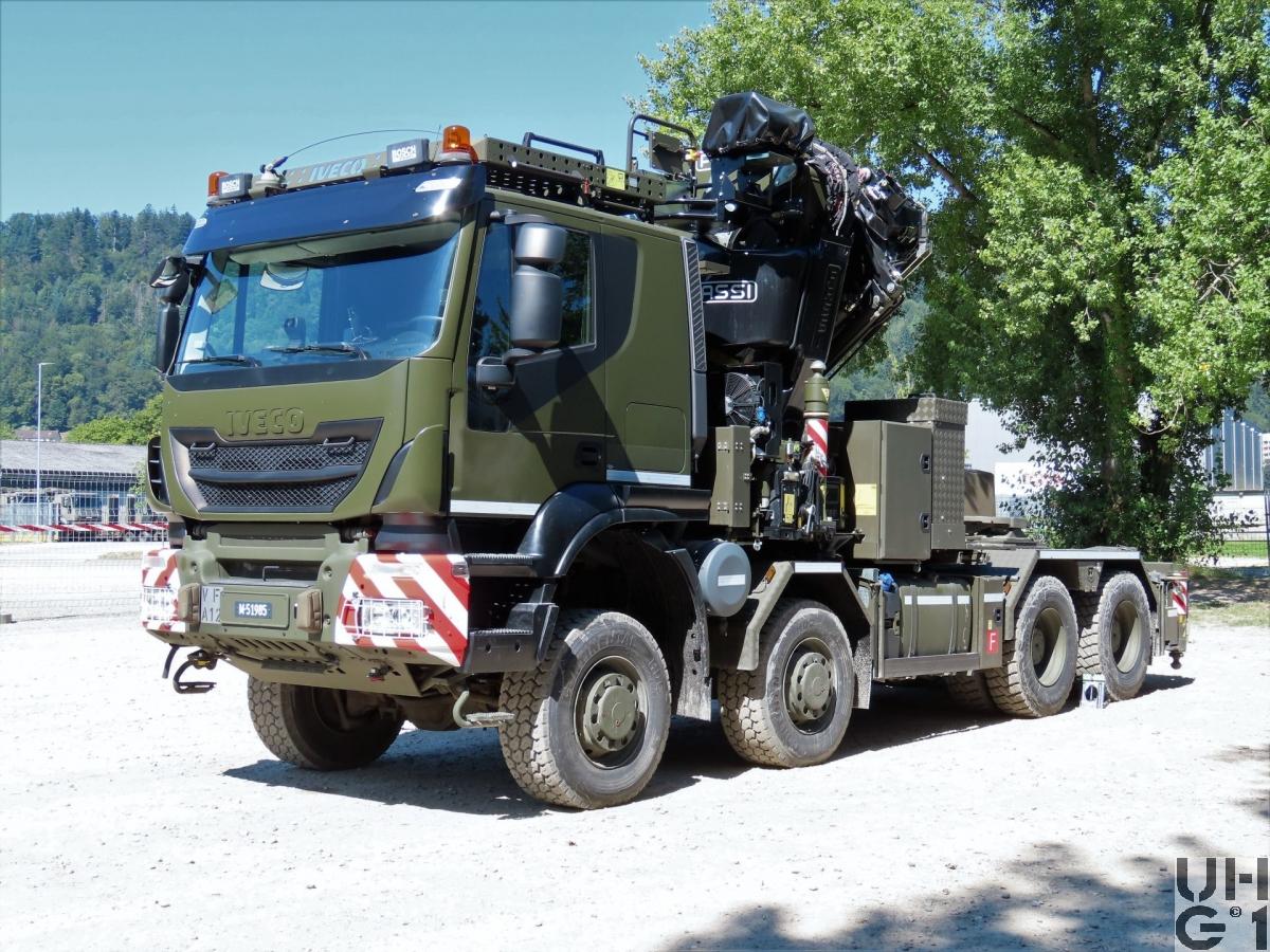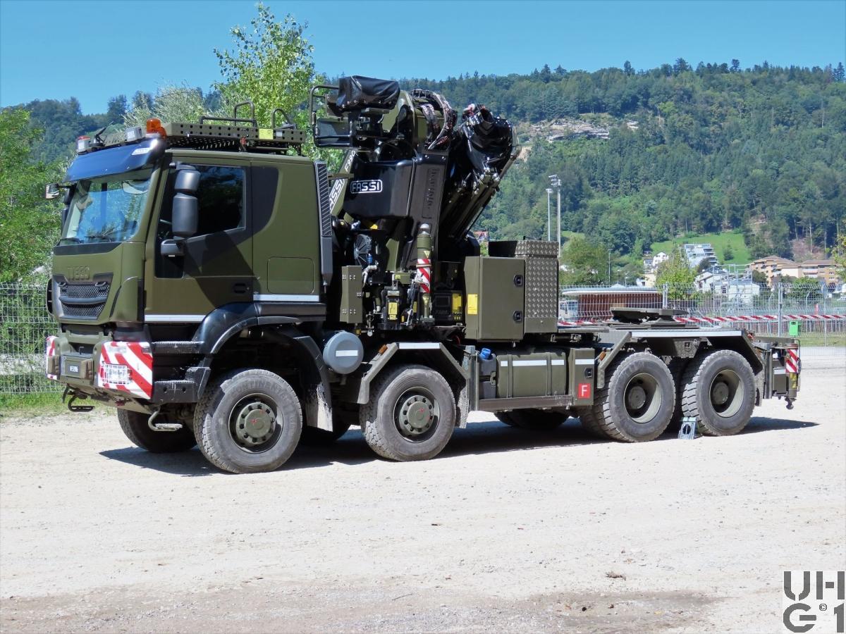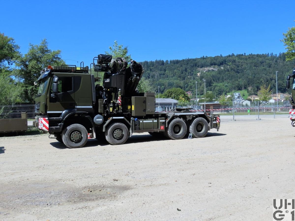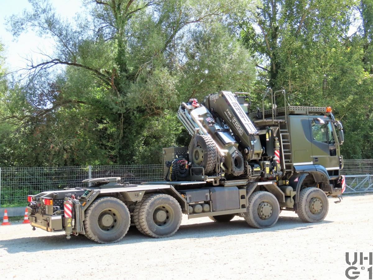 | Achsen | Vorne Starrachsen Doppelt übersetzte Antriebsachsen mit Radaussenantrieb Übersetzung 4,67:1 Je zwei doppelt wirkende hydraulische Teleskopstossdämpfer pro Achse Parabelfedern Lenkbare Hohlachsschenkel Drehstabstabilisator an der 1. Achse Differentialsperren automatisch betätigt Felgen 9.00 - 22,5 Stahlscheibenrad Bereifung Continental HDC 385/65R22,5 Einfachbereifung Reifendruckregelanlage Hinten Starrachsen Doppelt übersetzte Antriebsachsen mit Radaussenantrieb Übersetzung 4,67:1 Pneumatisch betätigtes Sperrdifferential Längssperren automatisch betätigt Achsführung über 4 Längslenker unten und 2 Längslenker oben Luftfederung ECAS an beiden Achsen Je 4 Luftbälge pro Achse Je zwei doppelt wirkende hydraulische Teleskopstossdämpfer pro Achse Drehstabstabilisator an beiden Achsen Felgen 9.00 - 22,5 Stahlscheibenrad Bereifung Continental HDC 1 315/80R22,5 Doppelbereifung Reifenregeldruckanlage |