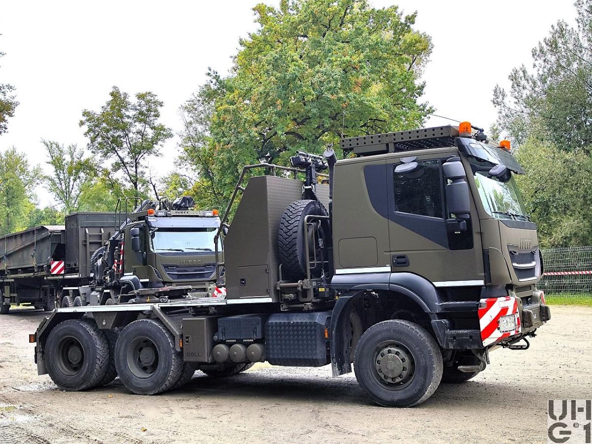 | Getriebe | Hauptgetriebe Hersteller ZF Typ 16 AS 2631 TO Eurotronic 2 mit Intarder 16 Vorwärtsgänge 2 Rückwärtsgänge Übersetzung 1. Gang 14,12:1 2. Gang 11,68:1 3. Gang 9,540:1 4. Gang 7,890:1 5. Gang 6,520:1 6. Gang 5,390:1 7. Gang 4,570:1 8. Gang 3,870:1 9. Gang 3,090:1 10. Gang 2,56:1 11. Gang 2,09:1 12. Gang 1,73:1 13. Gang 1,43:1 14. Gang 1,18:1 15. Gang 1,00:1 16. Gang 0,83:1 1. R-Gang 13,07:1 2. R-Gang 10,81:1 Verteilergetriebe Hersteller ZF Typ VG 2000/300 Übersetzung 0,89:1 Strassengang 1,54:1 Geländegang |