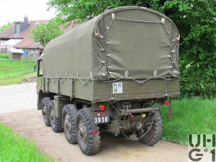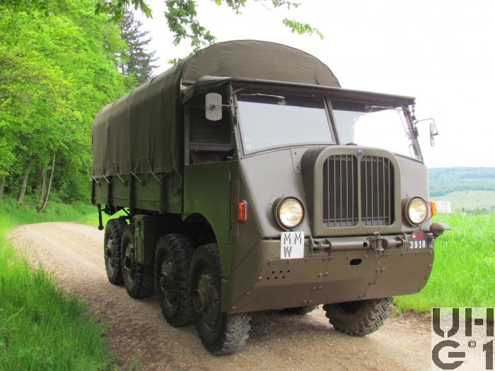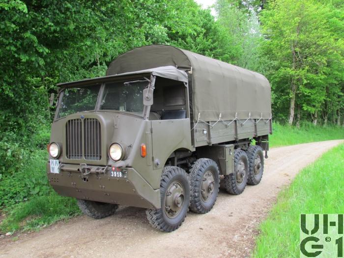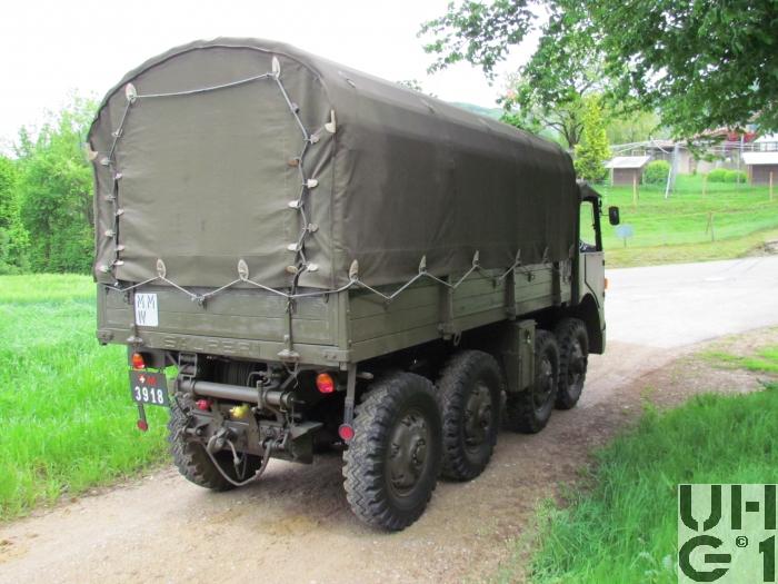 | Achsen | Vorne und hinten Pendelhalbachsen mit Drehpunkt auf Längstriebachse Progressiv gewundene Schraubenfedern, die über Schwinghebel und Zugstangen betätigt werden Keine Stossdämpfer Die Achstrompeten sind in den Differentialgehäusen geführt Erstes, drittes und viertes Differential sind selbstsperrend Felgen 7.00 - 20 Trilex Stahlguss Felgen Bereifung Firestone Super All Traction 9.00 - 20, 12 Ply Alle Räder Einfachbereifung Funktion Die Halbachsen sind paarweise miteinander ausgeglichen durch Zugstangen und Kniehebel Das Fahrzeug wird durch die vier vorderen Pendelhalbachsen in der Mittellage gehalten, indem die zwei rechten und die zwei linken Halbachsen je durch eine Zugstange verbunden sind Die vier Hinterräder sind paarweise durch Zugstangen über Ausgleichswaagen so miteinander verbunden, dass nur eine geringe seitliche Stabilisierung des Fahrzeuges eintritt |
