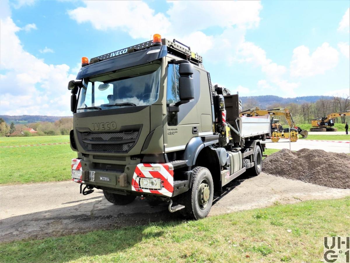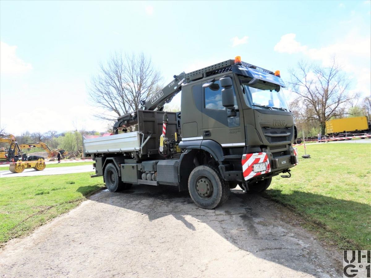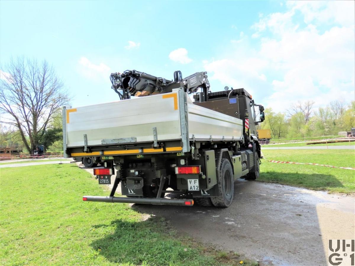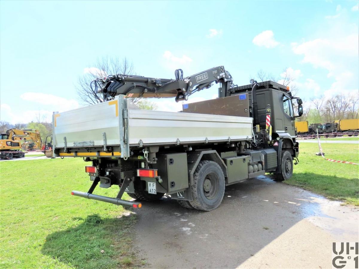 | Achsen | Vorne Starrachse Doppelt übersetzte Antriebsachse mit Radaussenantrieb Übersetzung 4,23:1 Zwei doppelt wirkende hydraulische Teleskopstossdämpfer Parabelfedern Lenkbare Hohlachsschenkel Drehstabstabilisator Differentialsperre automatisch betätigt Felgen 9.00 - 22,5 Stahlscheibenrad Bereifung Continental HDC 385/65 R 22,5 158 L Einfachbereifung Hinten Starrachse Doppelt übersetzte Antriebsachse mit Radaussenantrieb Übersetzung 4,23:1 Zwei doppelt wirkende hydraulische Teleskopstossdämpfer Pneumatisch betätigtes Sperrdifferential Längssperre automatisch betätigt Achsführung über 2 Längslenker unten Halbelliptik Federn Drehstabstabilisator Felgen 9.00 - 22.5 Stahlscheibenrad Bereifung Continental HDC 1 315/80 R 22,5 156/150 K Doppelbereifung |