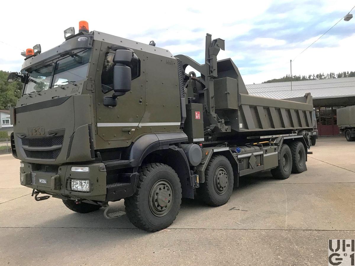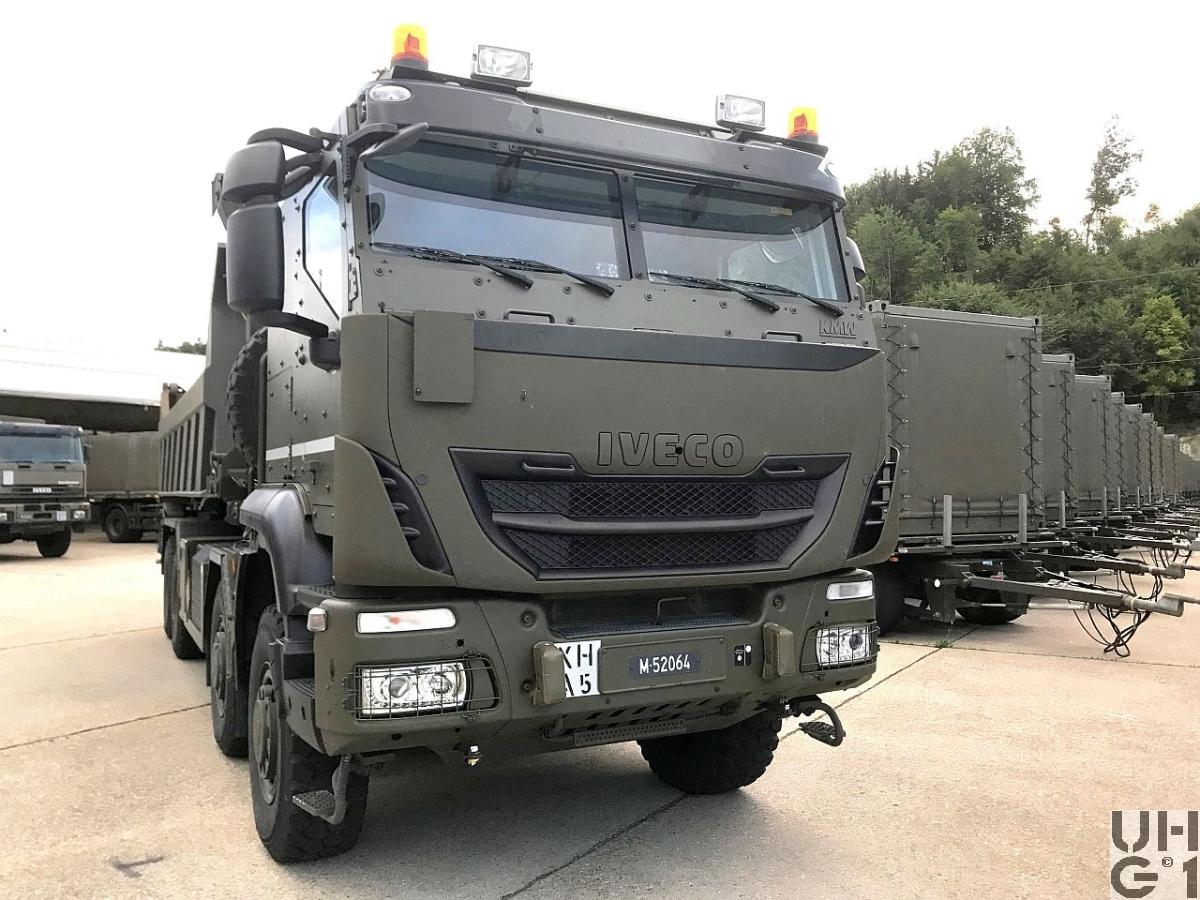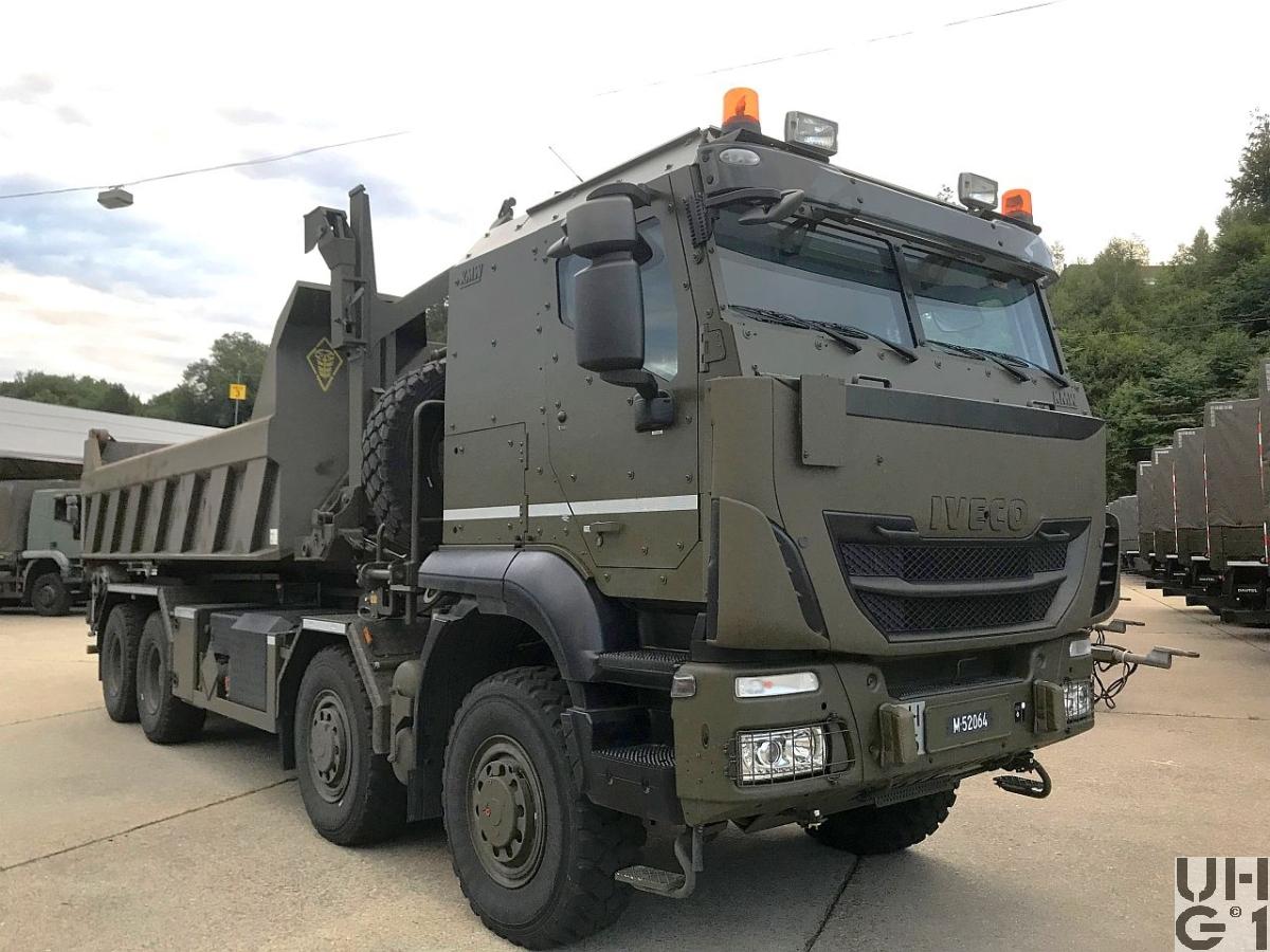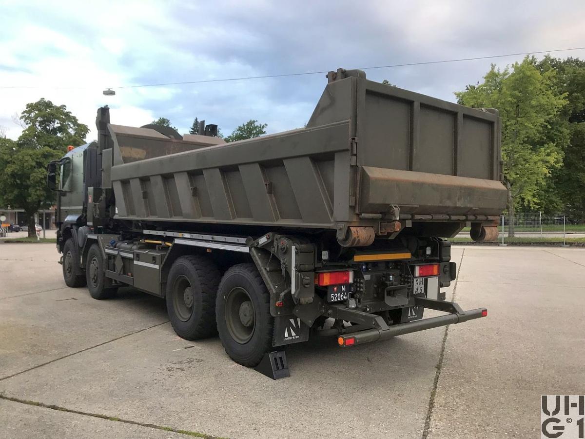| Achsen | Vorne Starrachsen Doppelt übersetzte Antriebsachsen mit Radaussenantrieb Übersetzung 4,67:1 Je zwei doppelt wirkende hydraulische Teleskopstossdämpfer pro Achse Parabelfedern Lenkbare Hohlachsschenkel Drehstabstabilisator an der 1. Achse Differentialsperren automatisch betätigt Einfachbereifung Reifendruckregelanlage Hinten Starrachsen Doppelt übersetzte Antriebsachsen mit Radaussenantrieb Übersetzung 4,67:1 Pneumatisch betätigtes Sperrdifferential Längssperren automatisch betätigt Achsführung über 4 Längslenker unten und 2 Längslenker oben Parabel-Federung Je zwei doppelt wirkende hydraulische Teleskopstossdämpfer pro Achse Drehstabstabilisator an beiden Achsen Einfachbereifung Reifenregeldruckanlage |