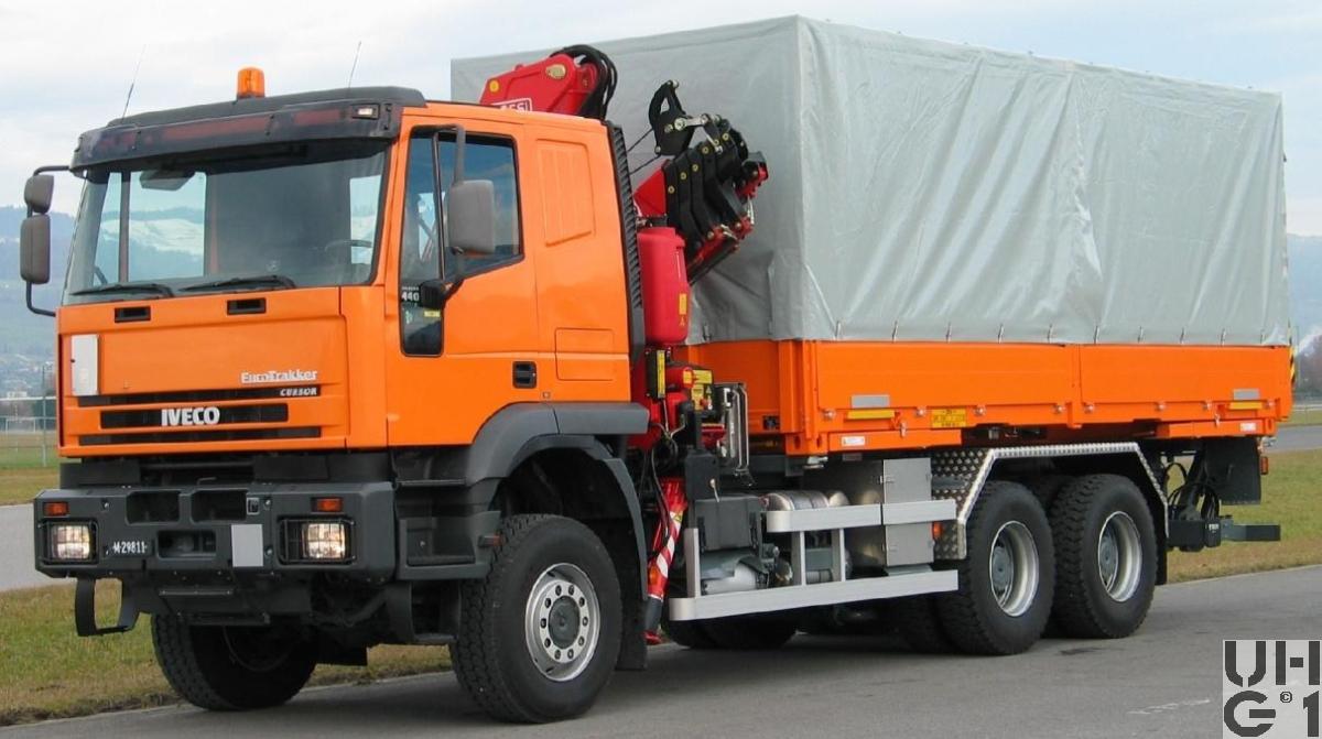 | Bemerkungen | Lieferanten Fahrgestell Iveco Magirus AG, DF-89079 Ulm Aufbau fassitec Transportsysteme AG, CH 5620 Bremgarten Ladekran Hersteller Fassi Typ F230AXP25 19 mt Hubmoment 14'650 mm Ausladung 9'850 mm Hydraulischer Auszug 58 Liter/min Pumpenleistung 400° Drehwinkel 36 kNm Schwenkmoment 320 bar Betriebsdruck 2'610 kg Gewicht Hebebühne Hersteller Trösch Typ Cargolift 2'000 kg Tragkraft |