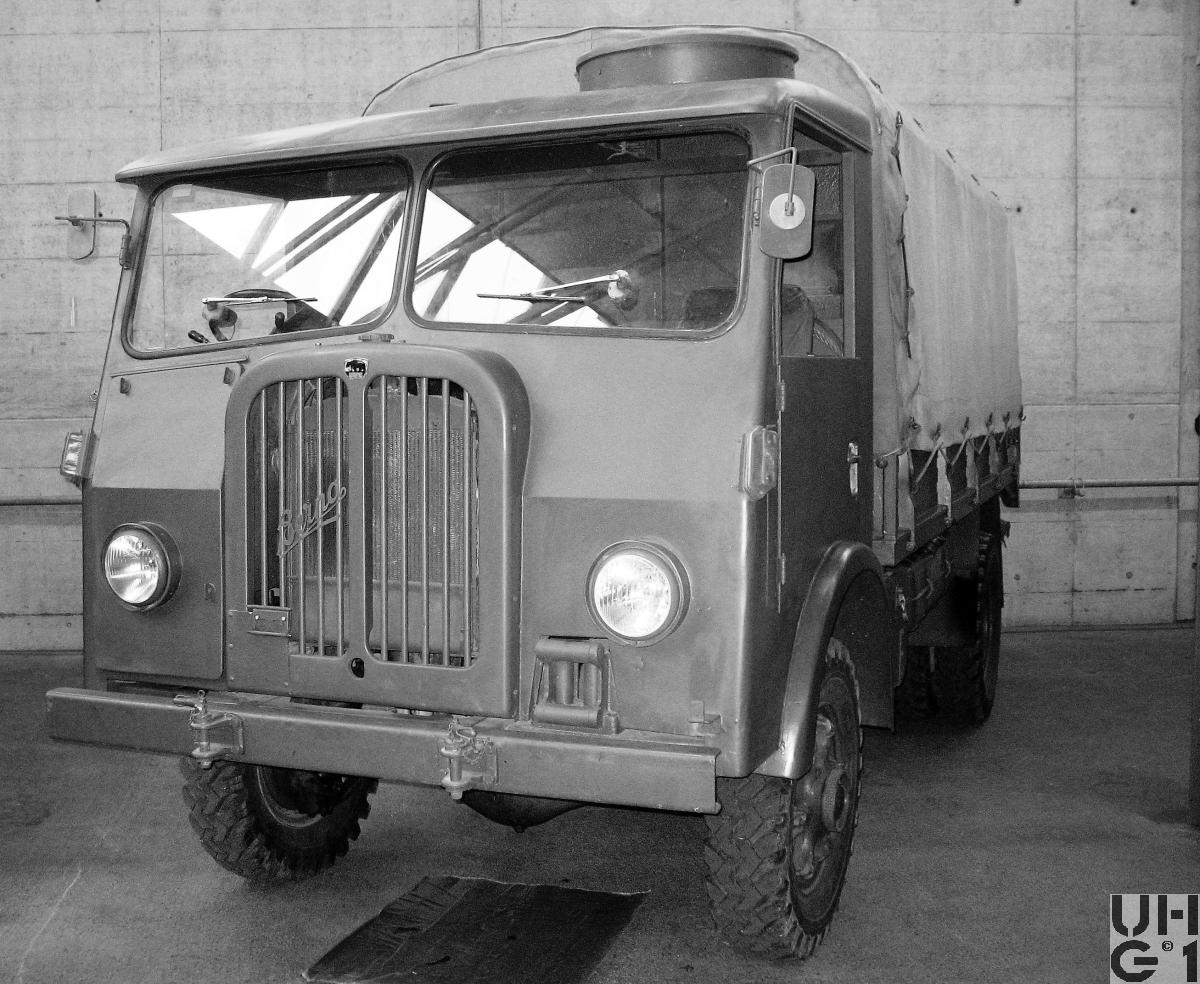 | Getriebe | Hauptgetriebe Hersteller Saurer Typ 2 C Mechanisches Zahnradwechselgetriebe 3. bis 5. Gang synchronisiert Sämtliche Gänge positiv verriegelt 5 Vorwärtsgänge 1 Rückwärtsgang Stockschaltung Übersetzung 1. Gang 4,88:1 2. Gang 3,00:1 3. Gang 1,70:1 4. Gang 1,00:1 5. Gang 0,75:1 R. Gang 5,14:1 Verteilergetriebe Mechanisches Reduktions- und Verteilergetriebe mit 2 synchronisierten Schaltstufen für Strassen- und Geländegang Untersetzung 1,165:1 Strassengang 2,536:1 Geländegang Bedienung der Schaltung Schalthebel Schwarz: Hauptgetriebe Schalthebel Rot: Geländegang und Vorderradantrieb Schalthebel Gelb: Differentialsperre Schalthebel Blau: Seilwinde |