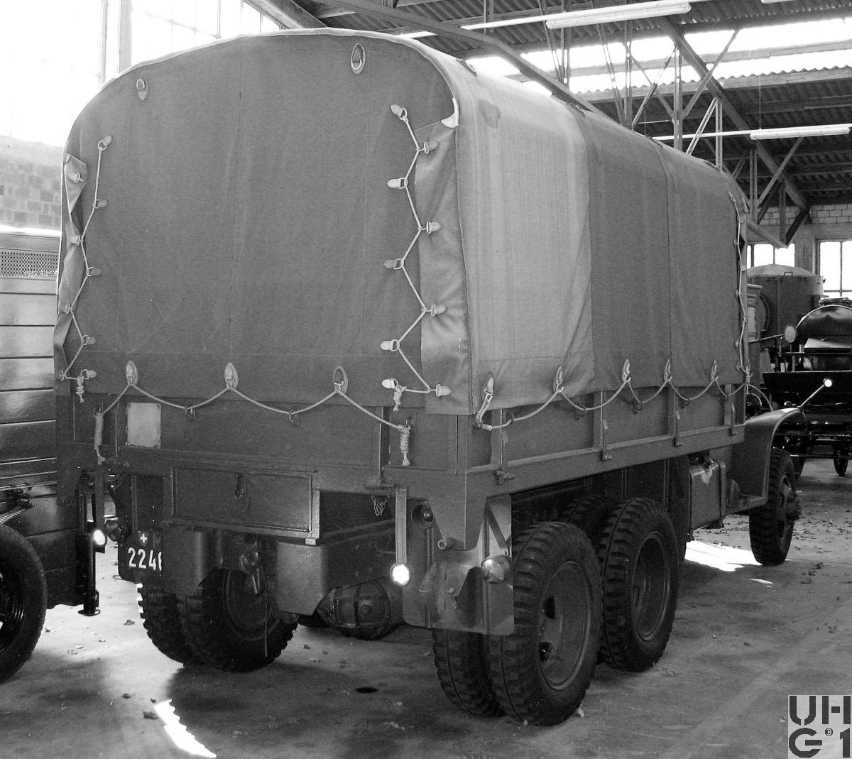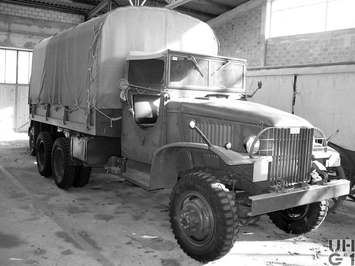 | Achsen | Vorne Hersteller GMC/Chevrolet Corporation Typ Banjo Starrachse Antriebsachse mit Hypoidantrieb und einfacher Rücksetzung Untersetzung 6,60:1 Radantrieb über homokinetische Antriebsgelenke Halbelliptische Längsblattfedern Hydraulische Hebelstossdämpfer Felgen Stahl Flachbettfelgen mit Sprengring Bereifung Firestone Ground Grip Type-ND 7.50 - 20, 8 Ply Einfachbereifung Hinten Hersteller GMC/Chevrolet Corporation Typ Banjo Starrachsen Antriebsachsen mit Hypoidantrieb und einfacher Rücksetzung Untersetzung 6,60:1 Radantrieb über Differentialwellen Halbelliptische Längsblattfedern, die je auf einem Privotzapfen drehbar gelagert und an jedem Ende auf eine der beiden Hinterachsen abgestützt sind Achsführung durch 4 gummigelagerte Torsionsstäbe unten und 2 gummigelagerte Torsionsstäbe oben Felgen Stahl Flachbettfelgen mit Sprengring Bereifung Firestone Ground Grip Type-ND 7.50 - 20, 8 Ply Doppelbereifung |