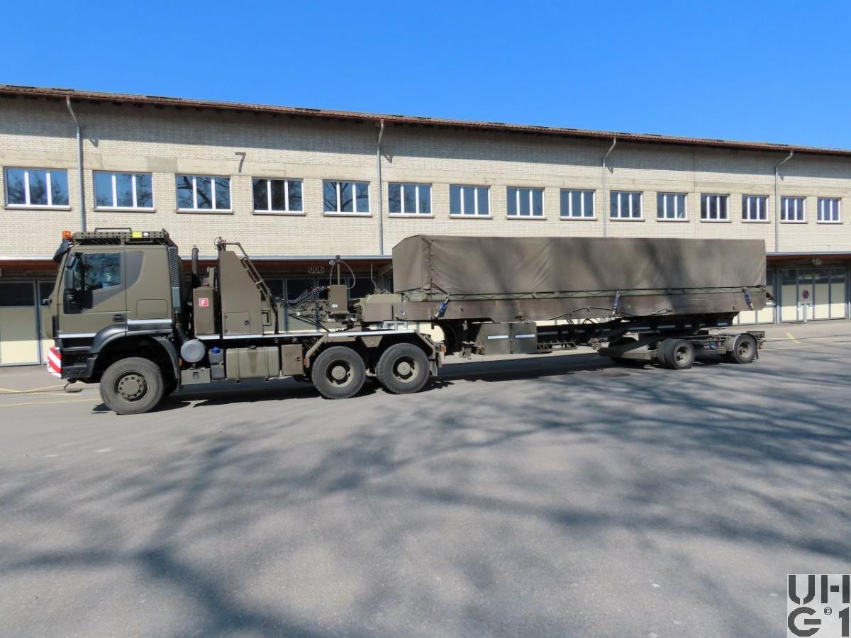 | Getriebe | Hauptgetriebe Hersteller ZF Typ 16 AS 2631 TO Eurotronic 2 mit Intarder 16 Vorwärtsgänge 2 Rückwärtsgänge Übersetzung 1. Gang 14,12:1 2. Gang 11,68:1 3. Gang 9,540:1 4. Gang 7,890:1 5. Gang 6,520:1 6. Gang 5,390:1 7. Gang 4,570:1 8. Gang 3,870:1 9. Gang 3,090:1 10. Gang 2,56:1 11. Gang 2,09:1 12. Gang 1,73:1 13. Gang 1,43:1 14. Gang 1,18:1 15. Gang 1,00:1 16. Gang 0,83:1 1. R-Gang 13,07:1 2. R-Gang 10,81:1 Verteilergetriebe Hersteller ZF Typ VG 2000/300 Übersetzung 0,89:1 Strassengang 1,54:1 Geländegang |