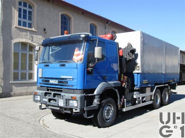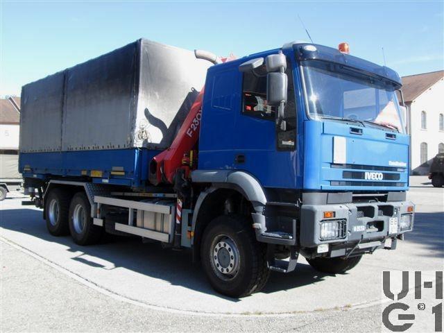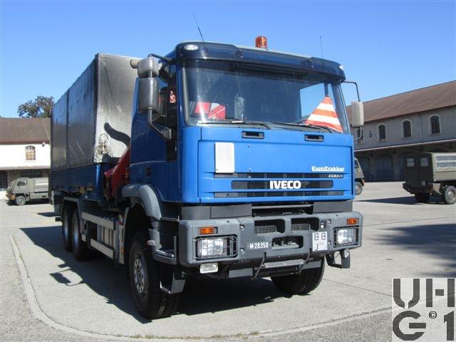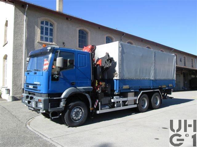 | Bemerkungen | Lieferanten Fahrgestell Iveco Magirus AG, DF-89079 Ulm Aufbau fassitec Transportsysteme AG, CH 5620 Bremgarten Aufbau Ladekran Fassi Wechselrahmen für ISO Container Hebebühne Ladekran Hersteller Fassi Typ F230AXP25 19 mt Hubmoment 14'650 mm Ausladung 9'850 mm Hydraulischer Auszug 58 Liter/min Pumpenleistung 400° Drehwinkel 36 kNm Schwenkmoment 320 bar Betriebsdruck 2'610 kg Gewicht Hebebühne Hersteller Trösch Typ Cargolift 2'000 kg Tragkraft Fahrzeuge werden für die Verwaltung eingesetzt, sie werden aber von Militärpersonal gefahren für allgemeine Transportaufgaben |