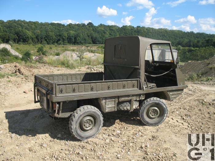 | Achsen | Vorne Einzelradaufhängung mittels gegabelter Pendelachse Als rohrförmiger Stahlblechkörper ausgebildet Kegelradantrieb mit Spiralverzahnung und einfacher Rücksetzung Untersetzung 4,22:1 Homokinetische Gelenke und Ritzelantrieb Untersetzung 2,72:1 Schraubenfedern Progressivwirkende Gummihohlfedern und Dreieckverstrebungen Doppeltwirkende hydraulische Teleskopstossdämpfer Felgen 3.50 - 12 Scheibenräder Bereifung Maloya 165 - 12, 4 Ply Geländereifen Einfachbereifung Hinten Einzelradaufhängung mittels gegabelter Pendelachse Als rohrförmiger Stahlblechkörper ausgebildet Kegelradantrieb mit Spiralverzahnung und einfacher Rücksetzung Untersetzung 4,22:1 Ritzelantrieb Untersetzung 2,72:1 Schraubenfedern Progressivwirkende Gummihohlfedern und Dreieckverstrebungen Doppeltwirkende hydraulische Teleskopstossdämpfer Felgen 3.50 - 12 Scheibenräder Bereifung Maloya 165 - 12, 4 Ply Geländereifen Einfachbereifung |