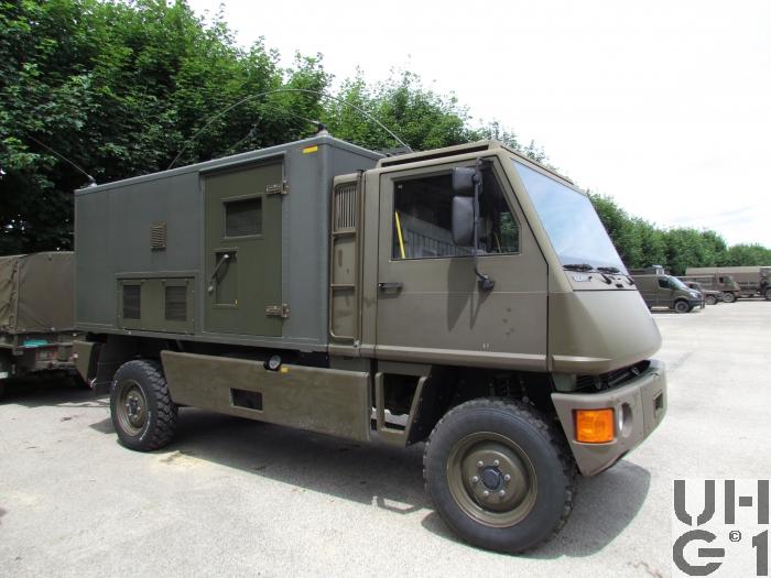 | Getriebe | Hauptgetriebe Mercedes Benz Typ W 4 A 028 4 Gang Automat hydraulisch gesteuert 4 Vorwärtsgänge 1 Rückwärtsgang Übersetzung 1. Gang 3,871:1 2. Gang 2,247:1 3. Gang 1,436:1 4. Gang 1,000:1 R-Gang 5,586:1 Verteilergetriebe Bucher Typ V-2GS-TD 15 Synchronisiertes 2- Stufen Verteilergetriebe mit Torsen Längsdifferential 1 Stufe Strassenstufe 1 Stufe Berg- / Geländestufe Übersetzung 0,71:1 Strassengang 1,42:1 Geländegang |